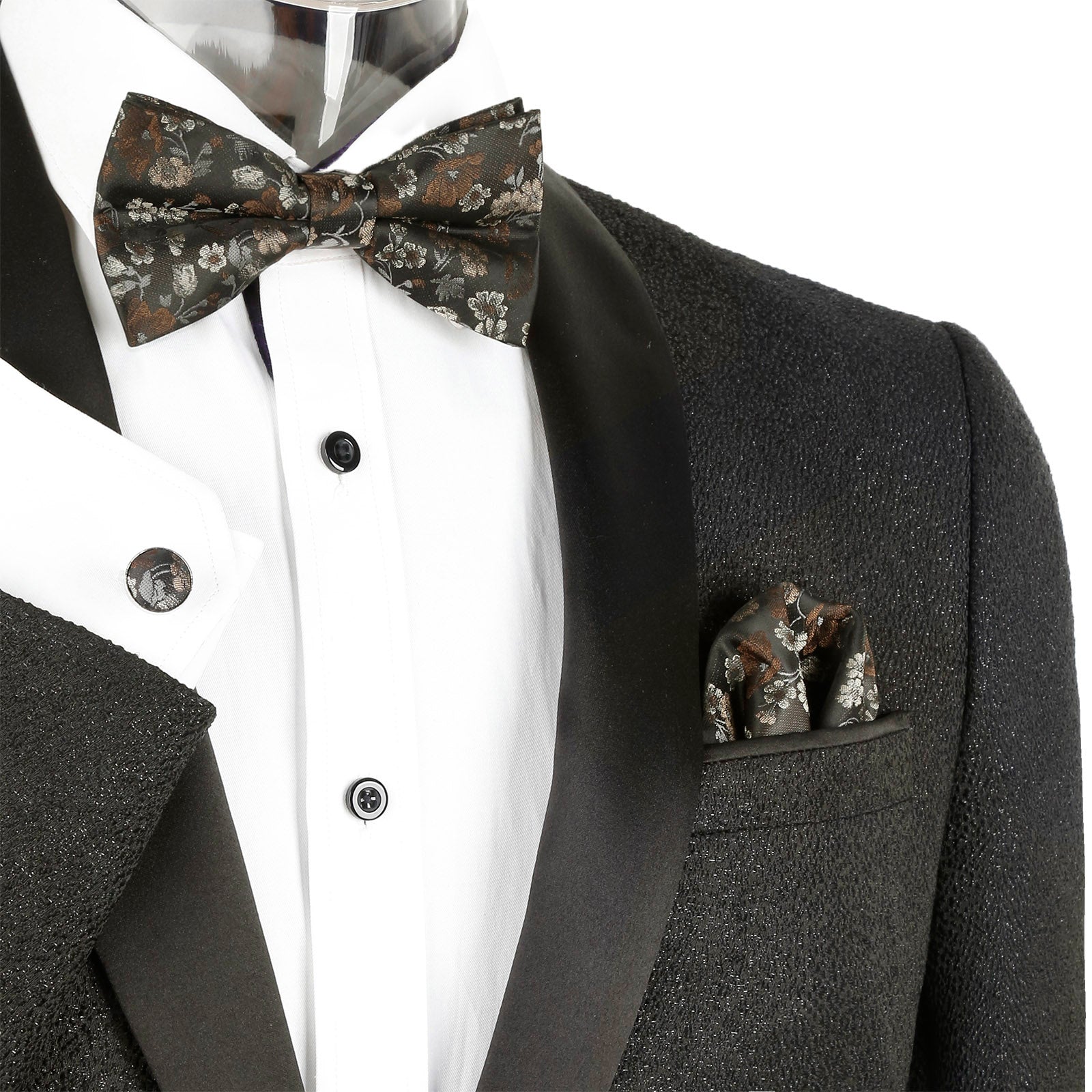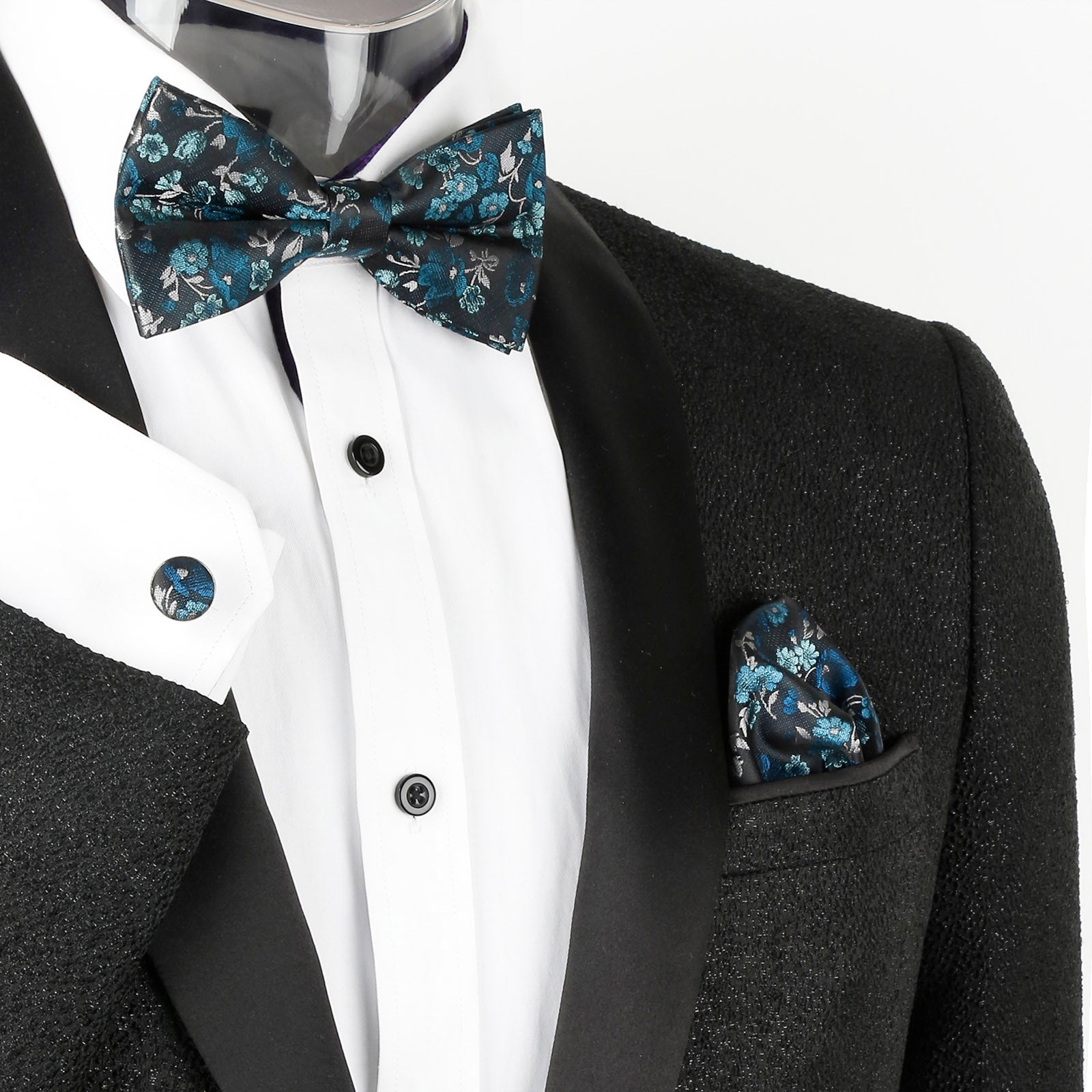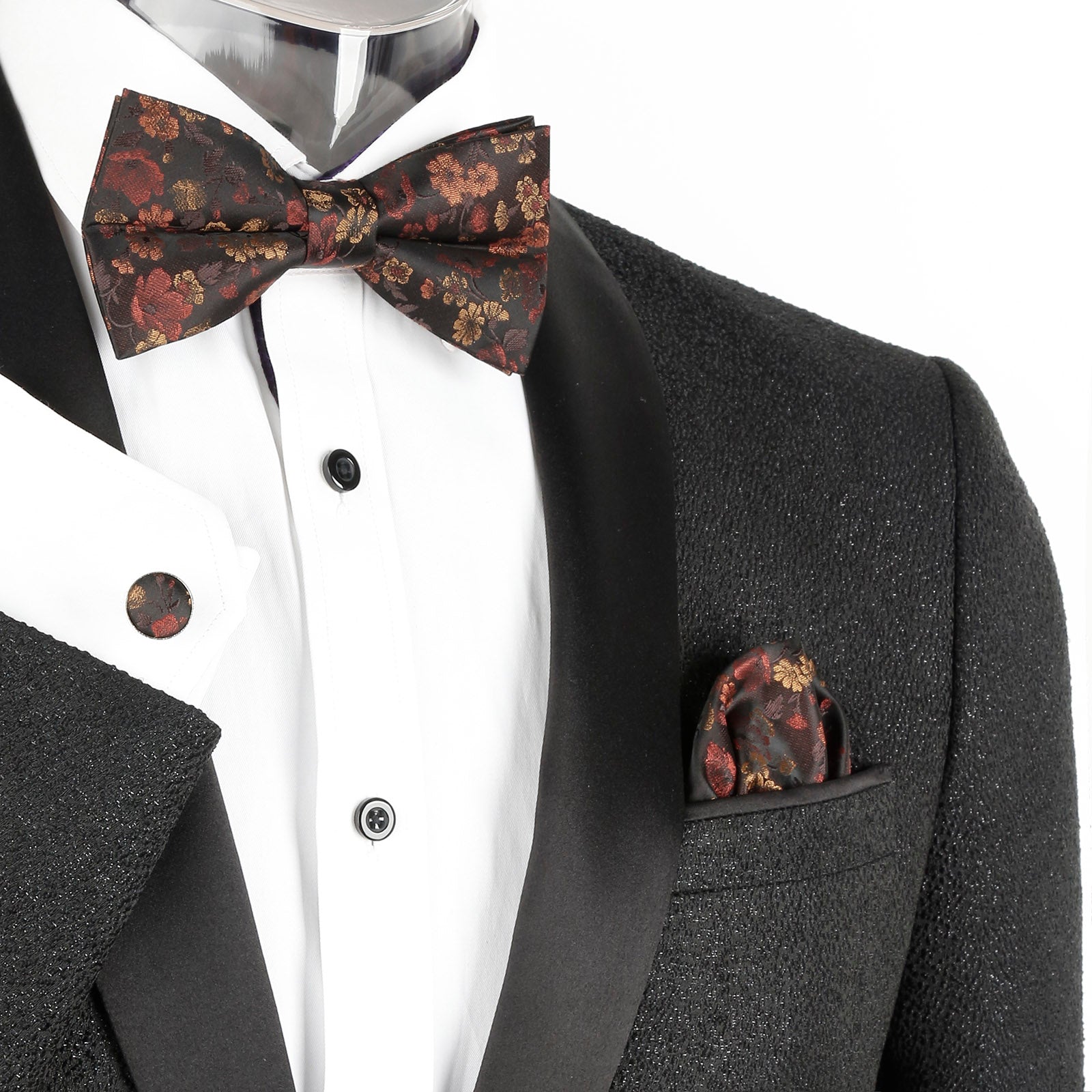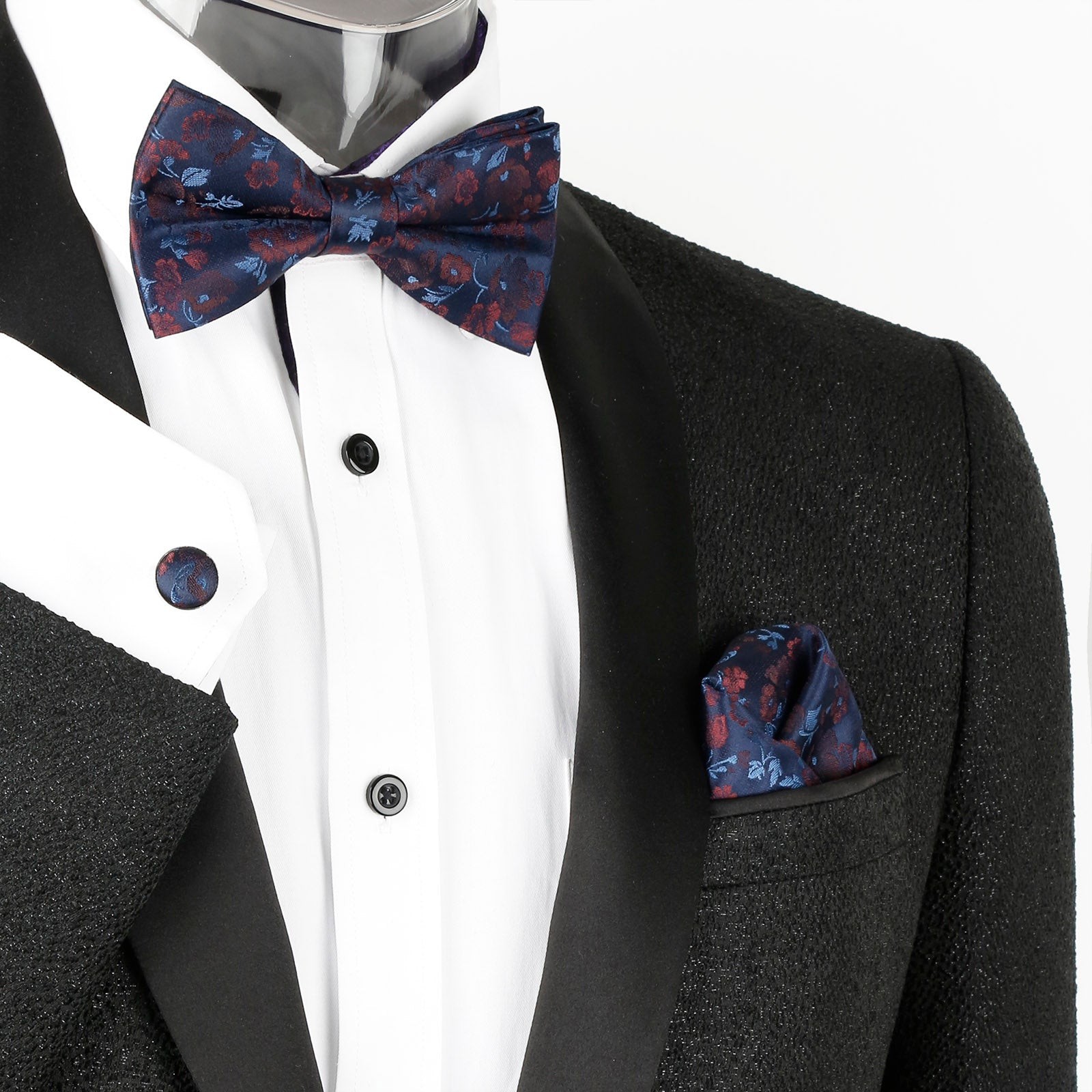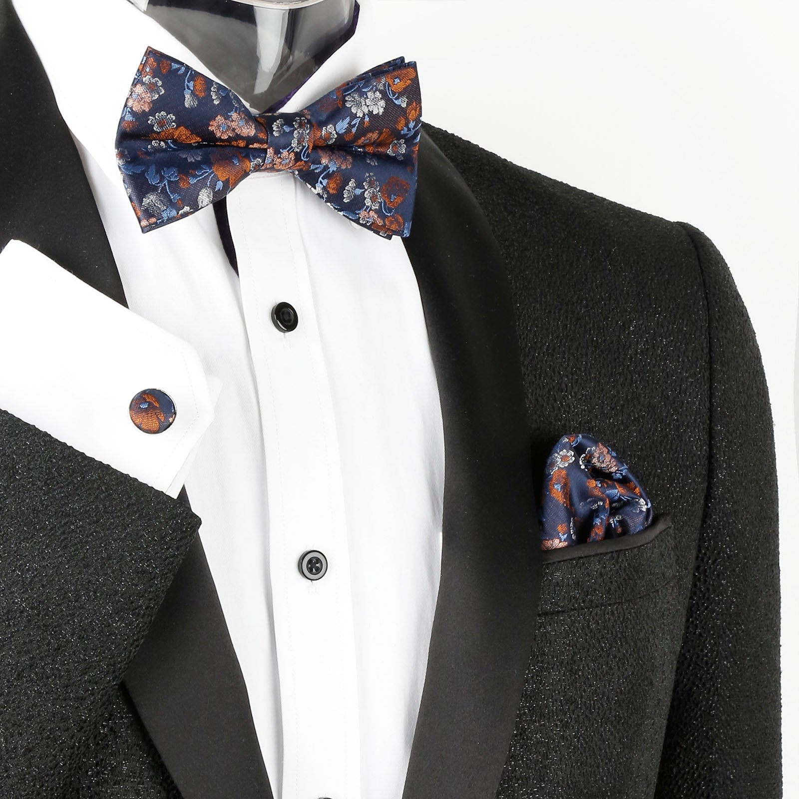 Mens Pre-tied Floral Woven Bow Tie, Handkerchief, Cufflinks Set-006