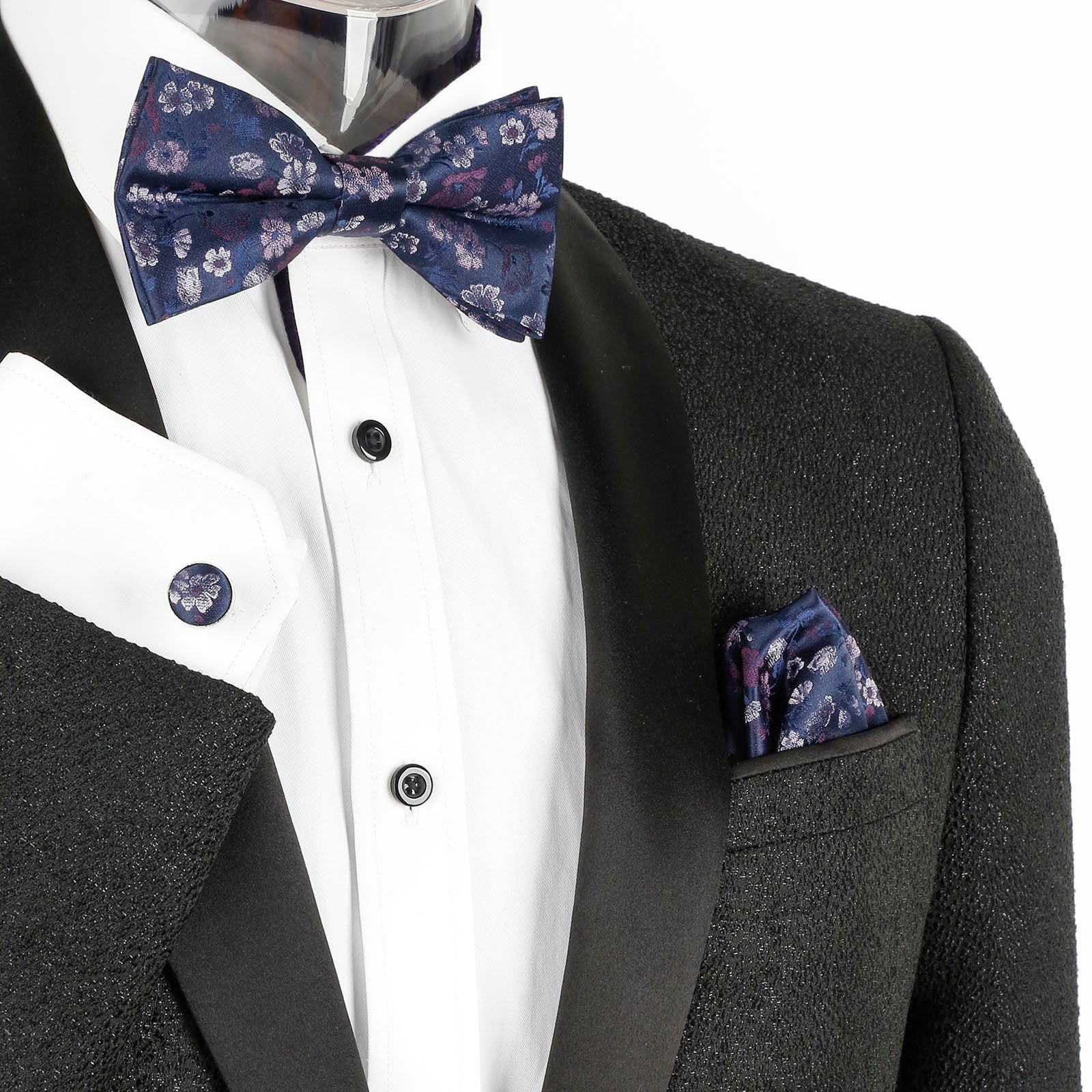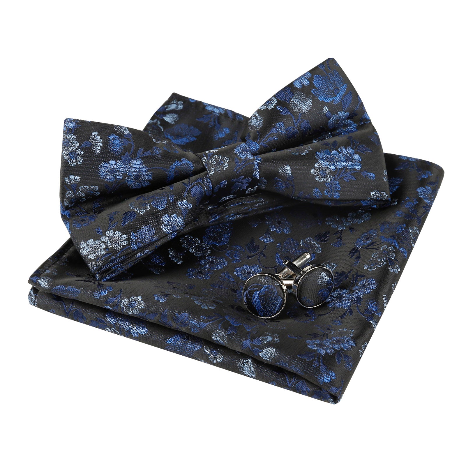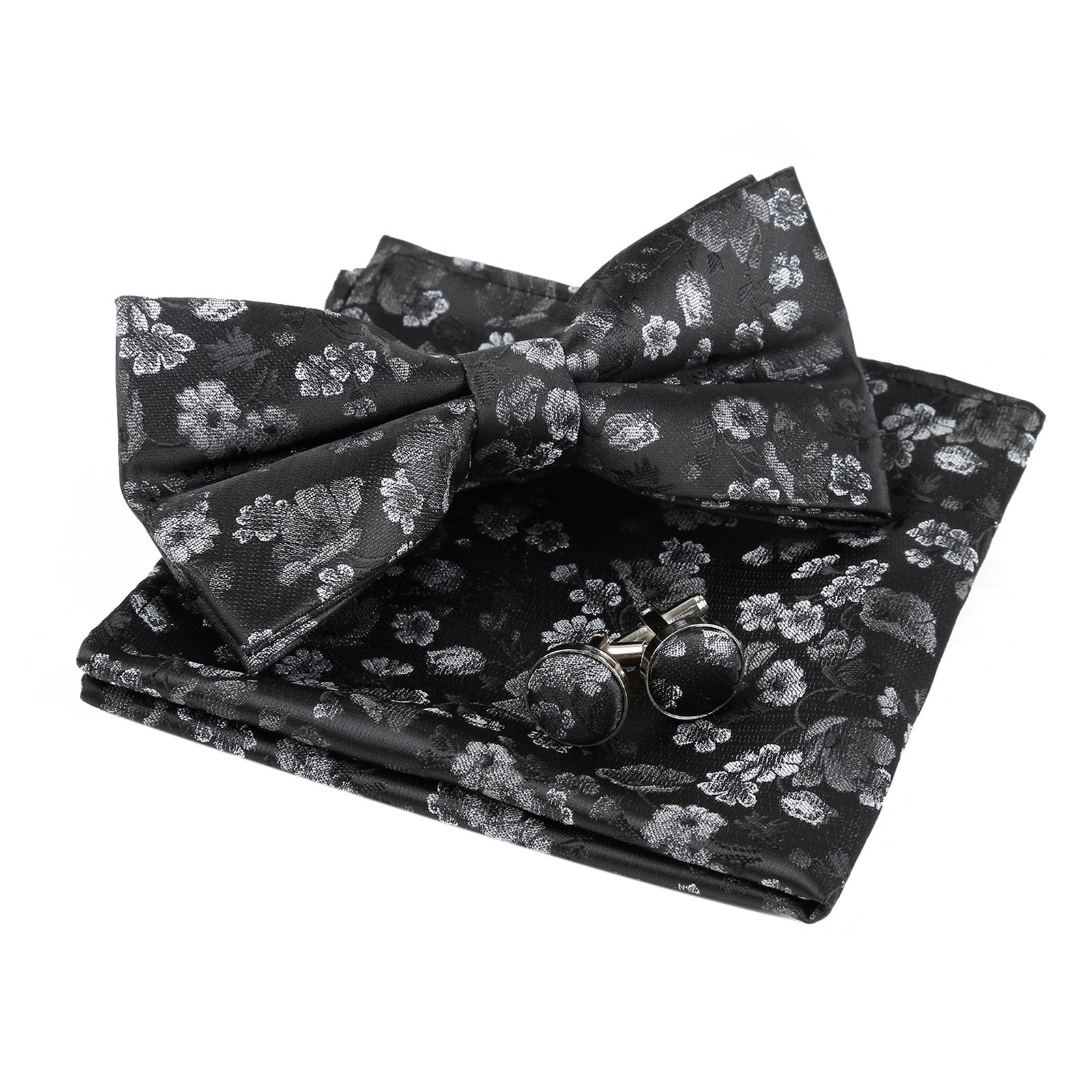 - Package includes: 1*Pre-tied Bow Tie (4.7*2.5inches/12*6.5cm) , 1*Pocket Square (9.5*9.5inches/24*24cm) and a pair of Cufflinks in a gift box