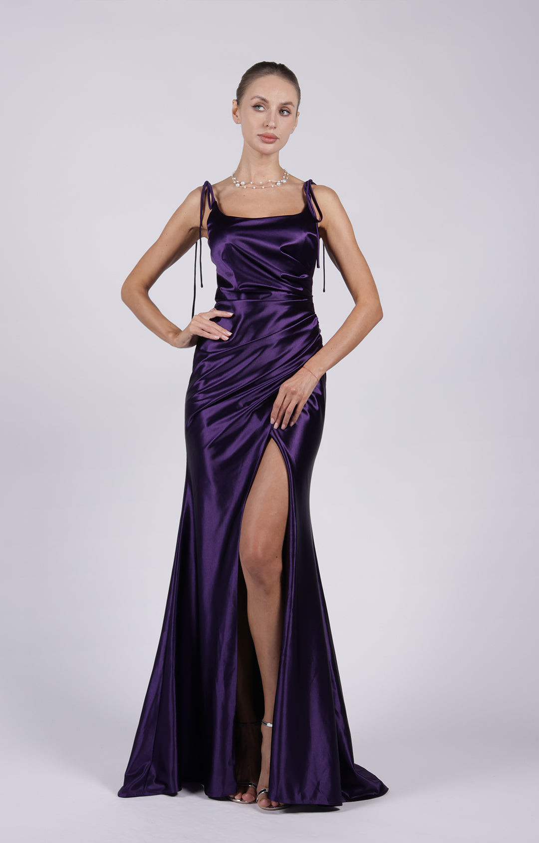 Square-Neck Adjustable Strap Pleated High Split Skinny Sweep Train Dresses