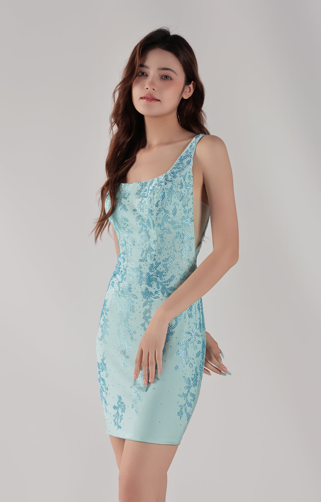 Square Collar Bodice Spaghetti Straps Rhinestones Sheath Mini Dress