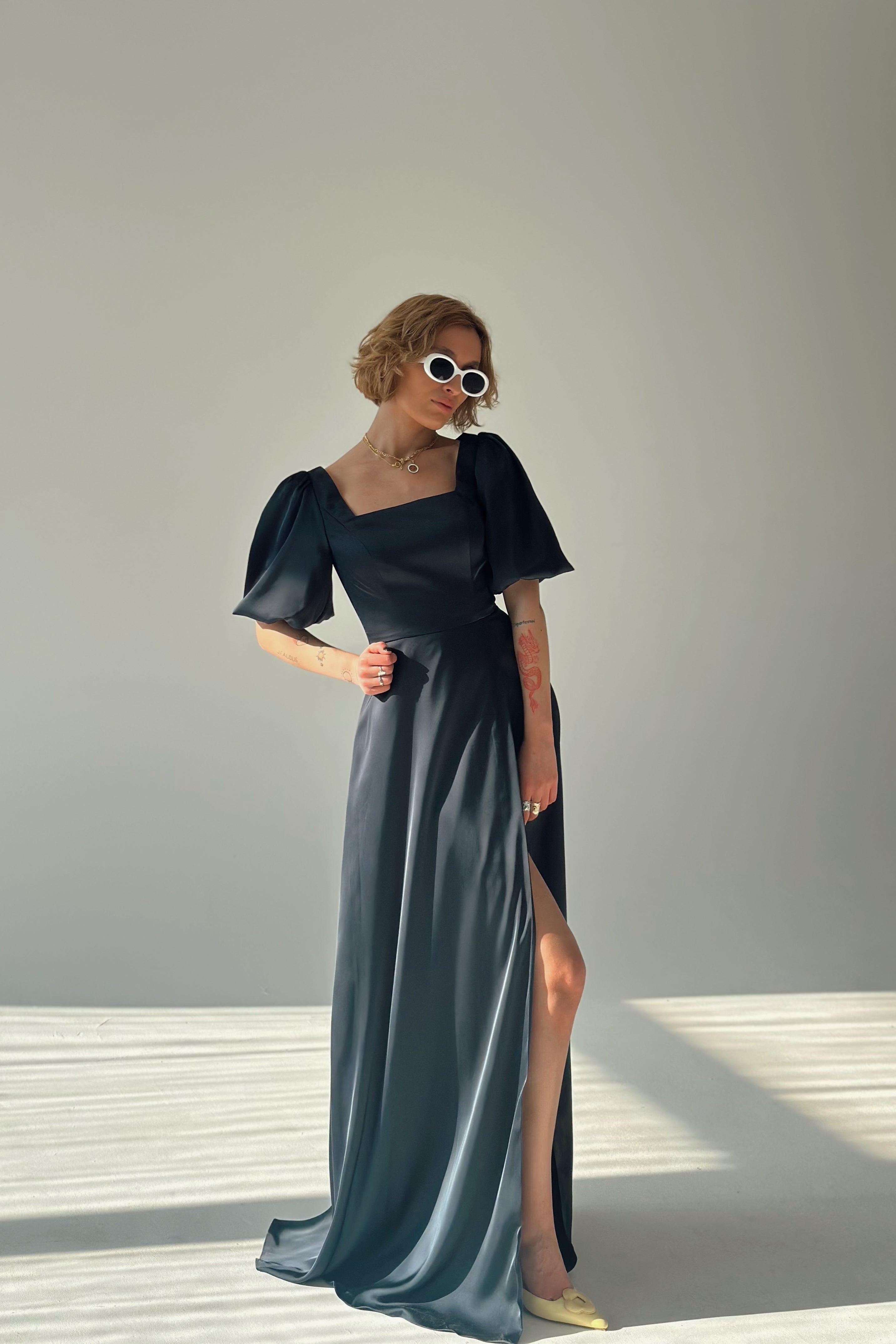 Square Neck Puffy Sleeve High Split Bridesmaid Maxi Dress