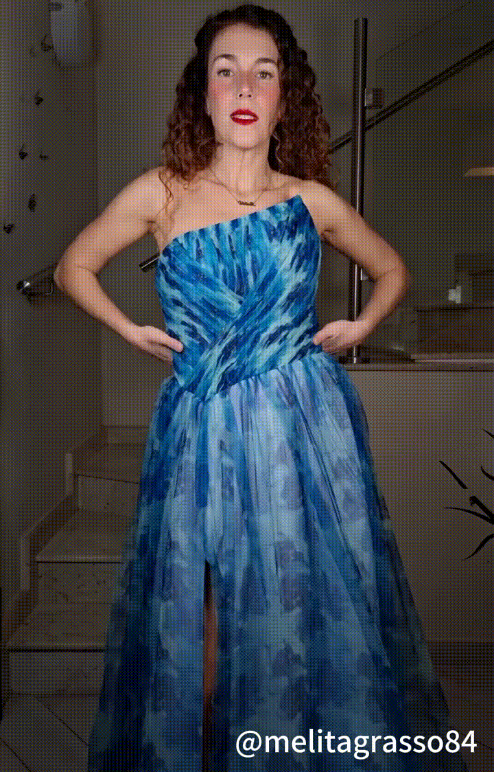 Strapless A-Line Pleats High Split Floral Printed Mesh Maxi Dress