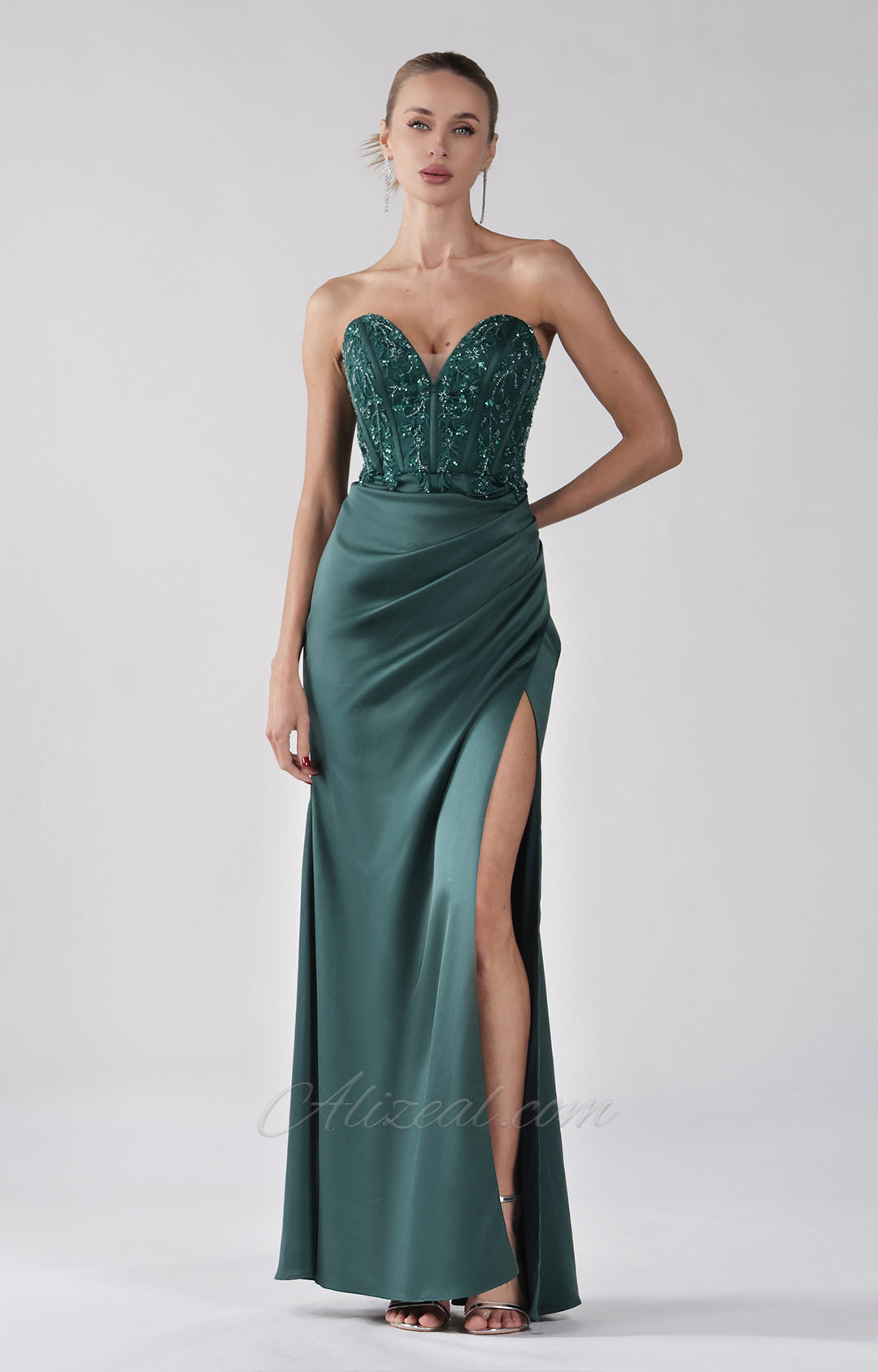 Strapless Appliqued Bodice Split Maxi Evening Dress