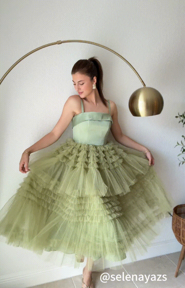 Square-Neck Spaghetti Straps Satin Mesh Patchwork Mid-Calf Cake Dresses