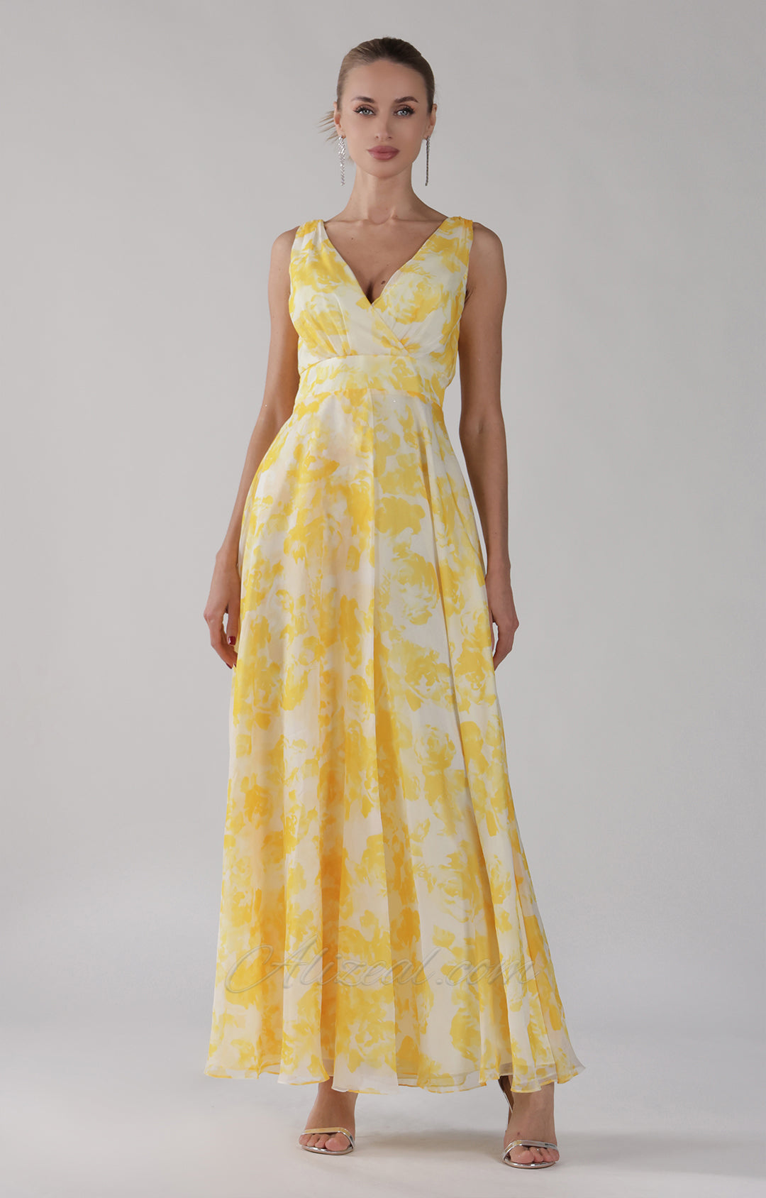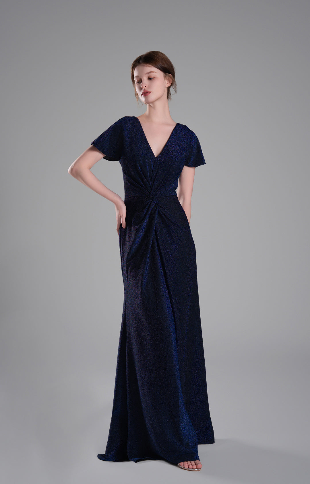 V- Neck Cap Sleeves Pleated Floor Length Dress
