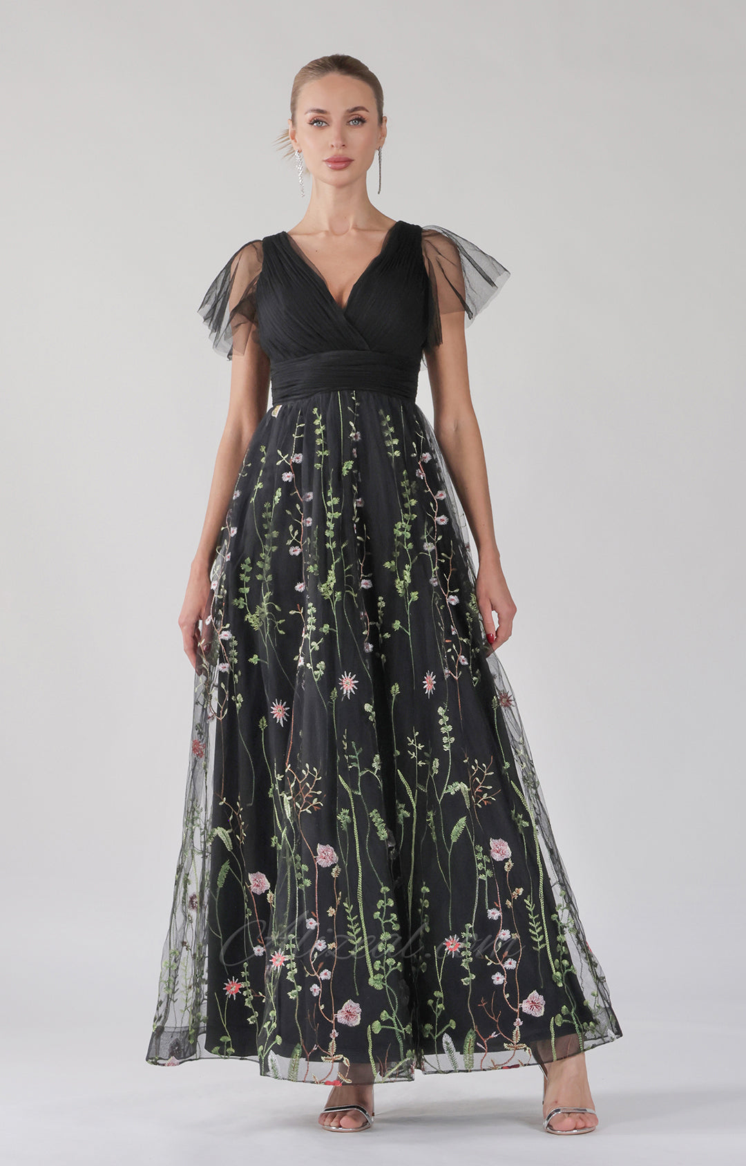 V-Neck A-Line Tulle Ruffle Sleeves Embroidered Maxi Dress
