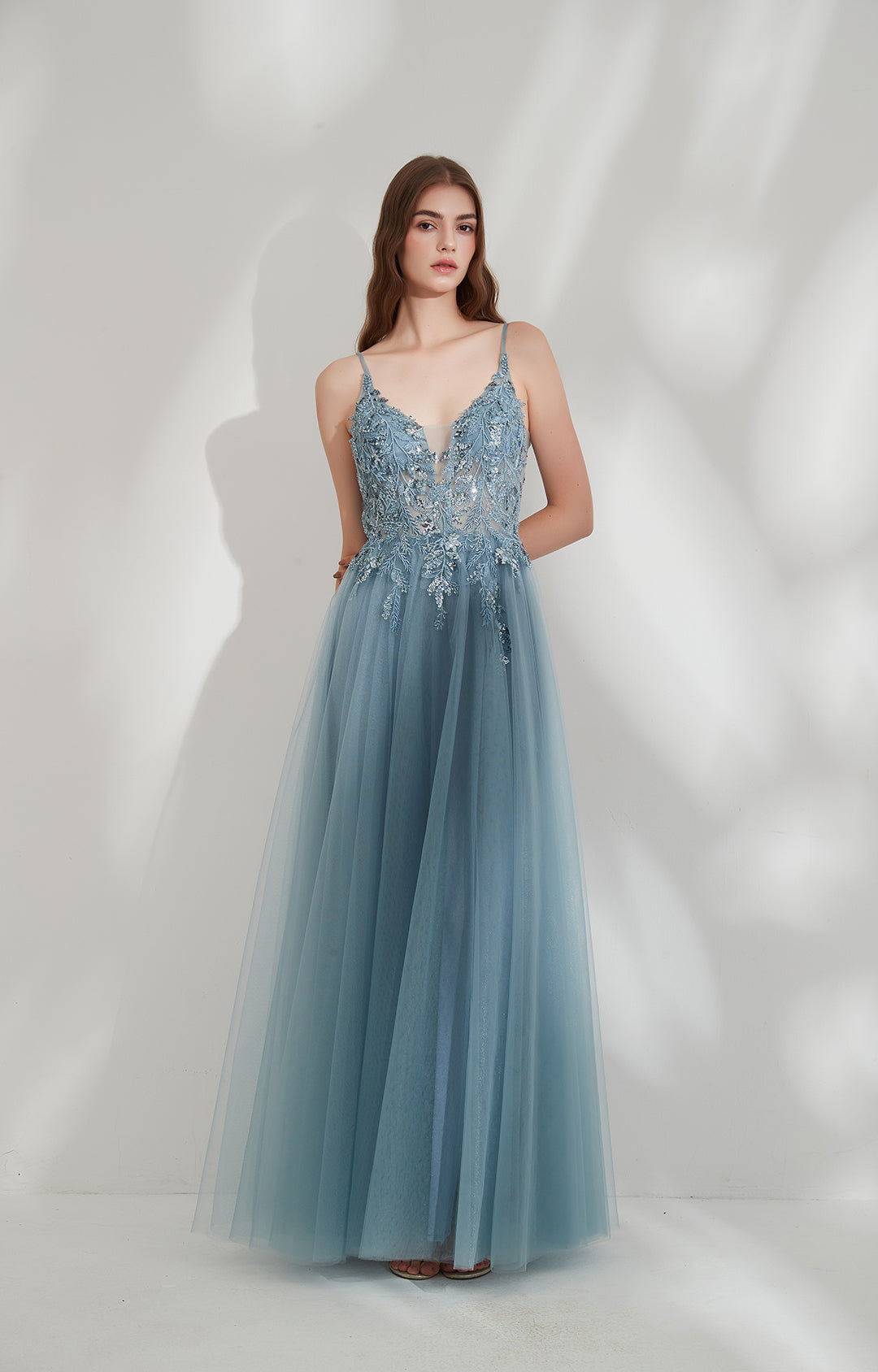 V-Neck Spaghetti Straps Sequin Appliqued Prom Dresses