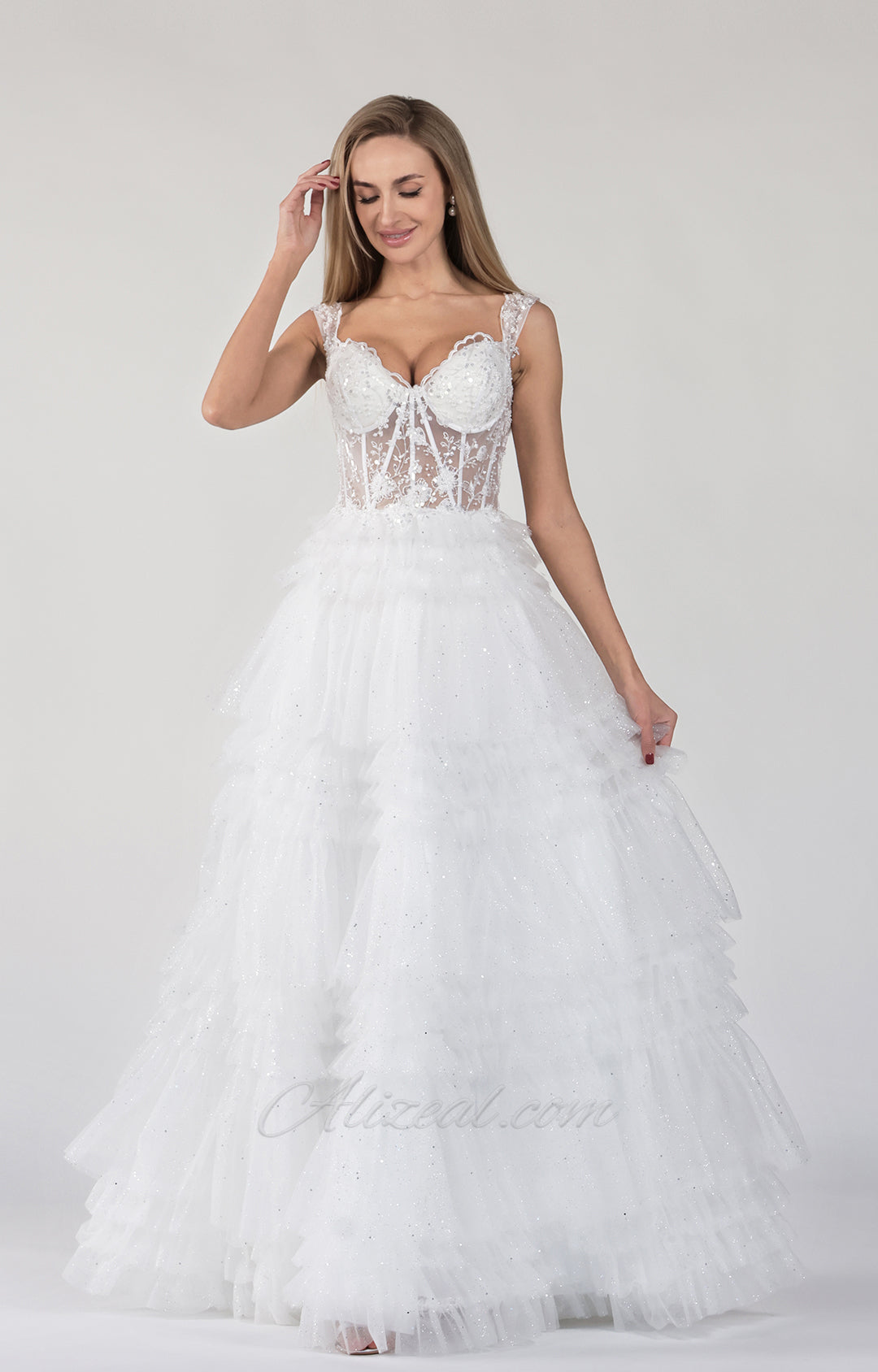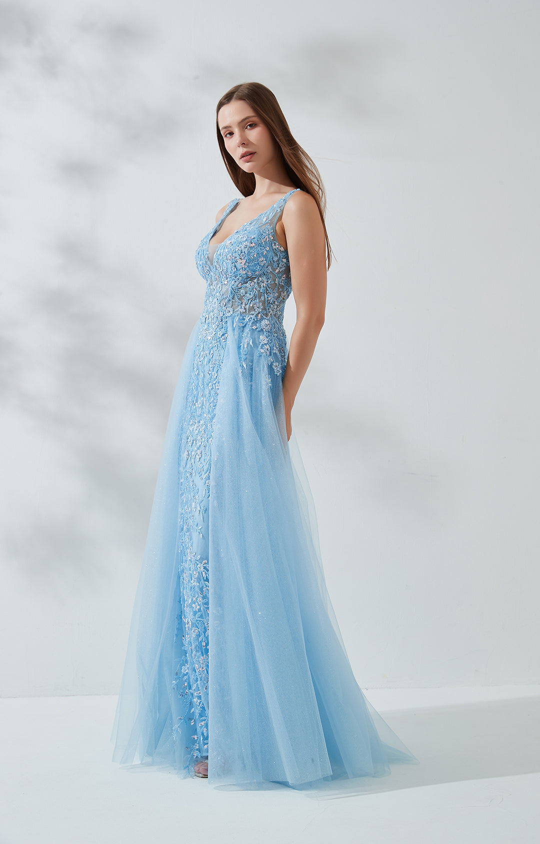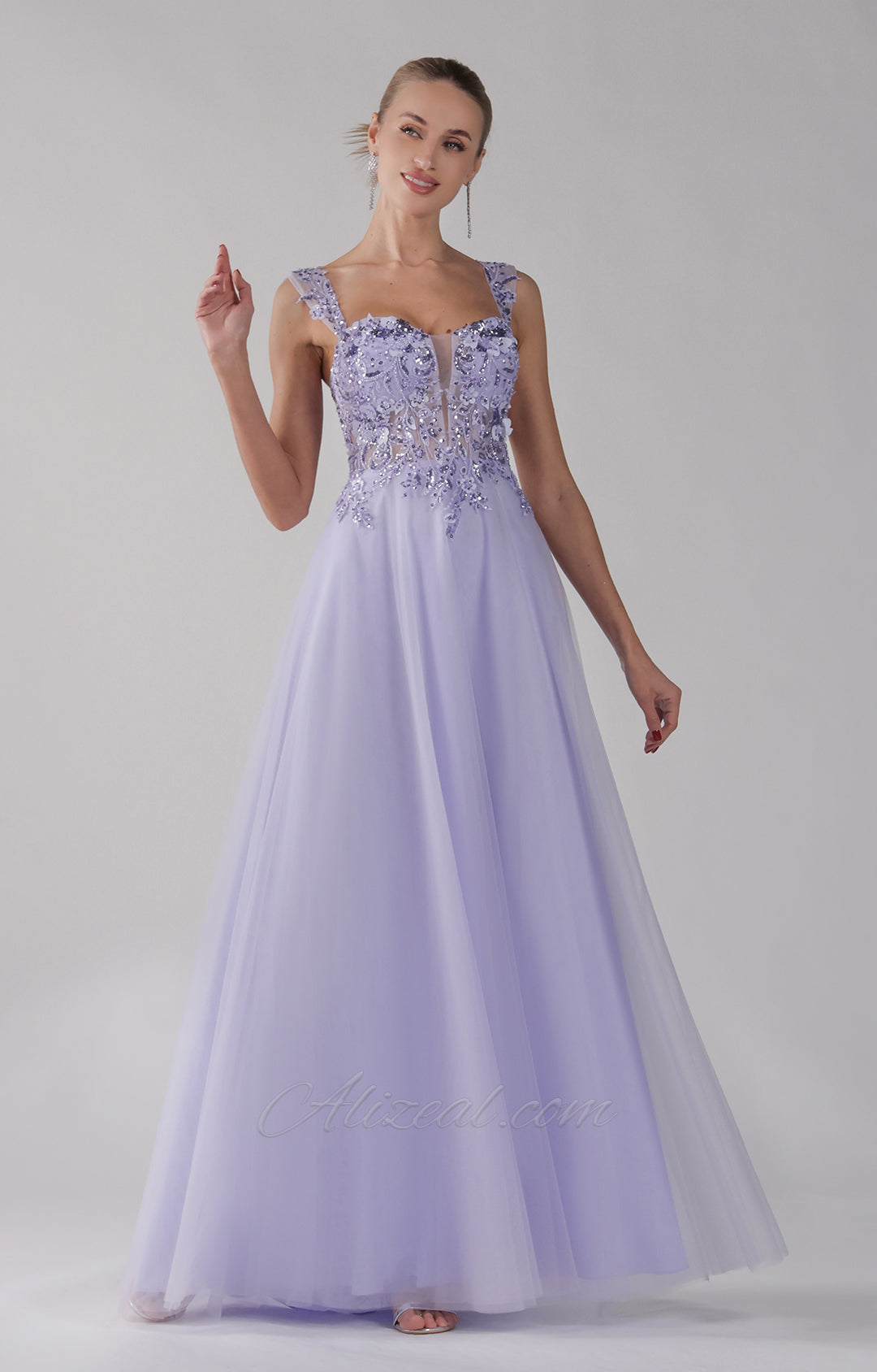 V-Neck Wide Strap Sleeveless Lace Embroidered Sequin Prom Dress