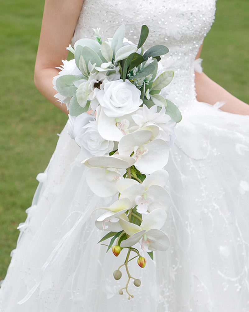 Waterfall Cascading Artificial Flower White Rose Phalaenopsis Bride Bouquet
