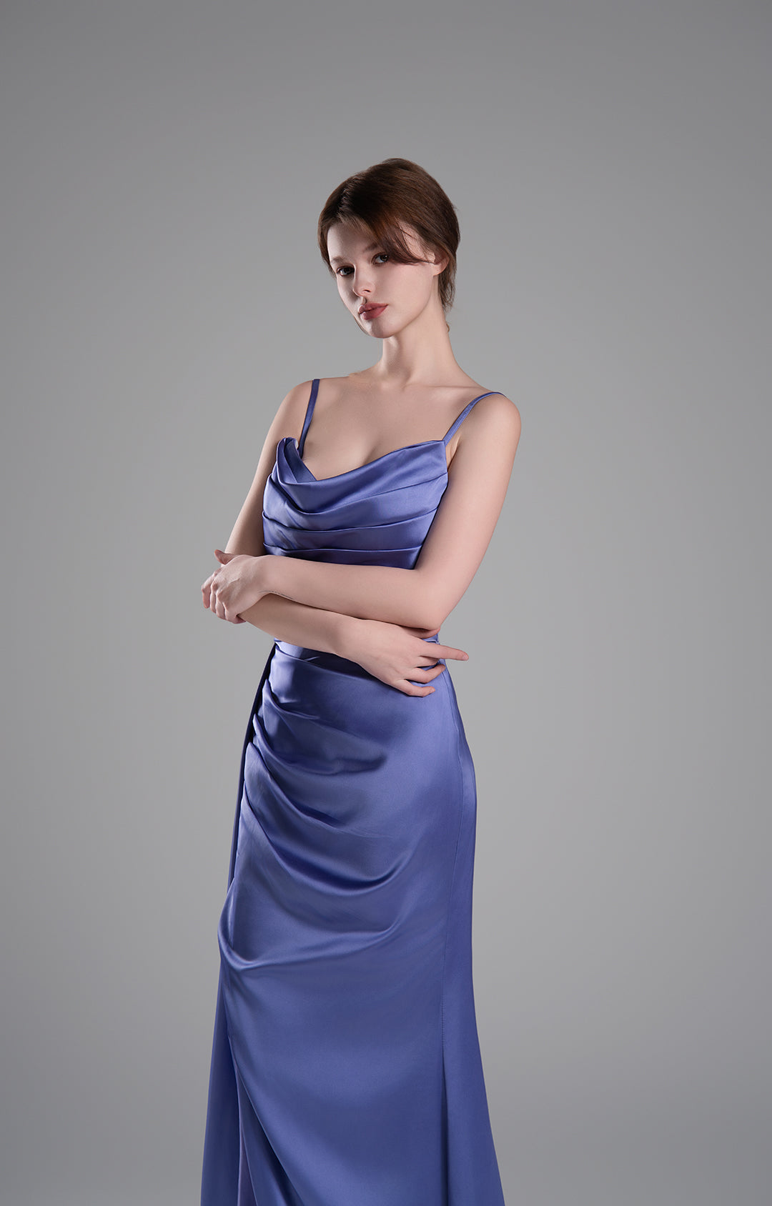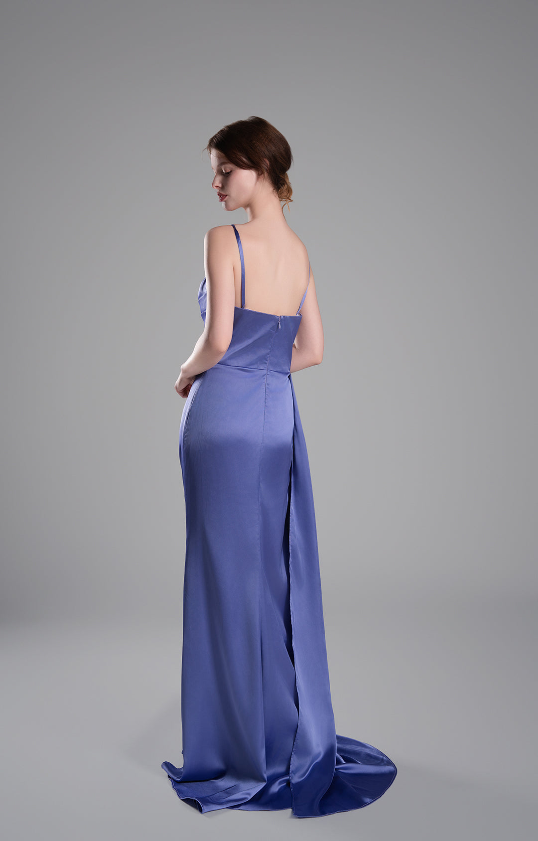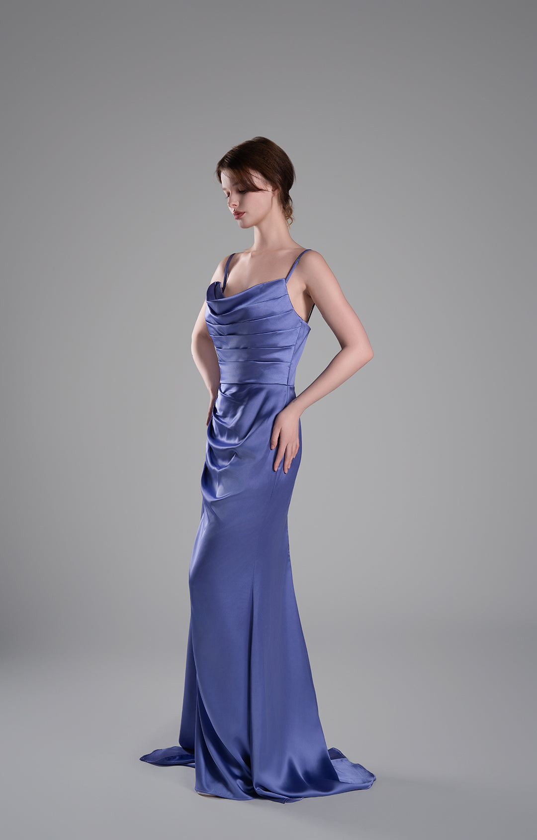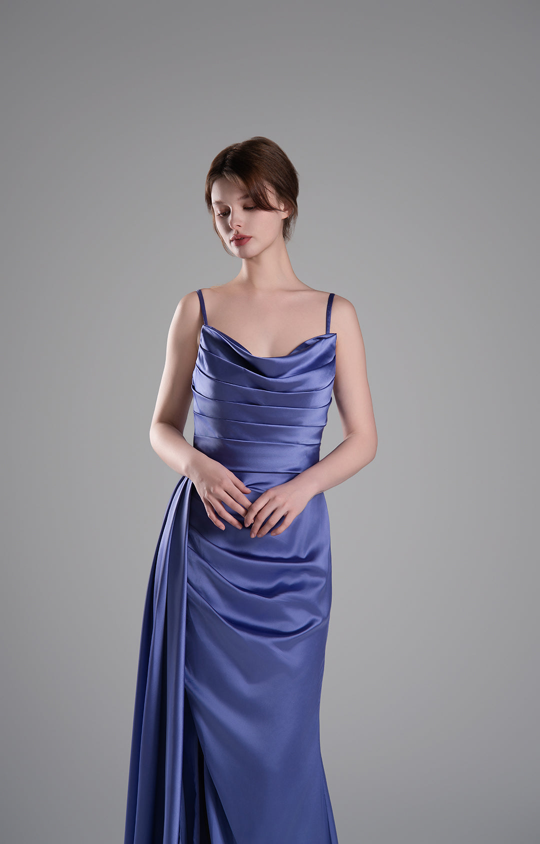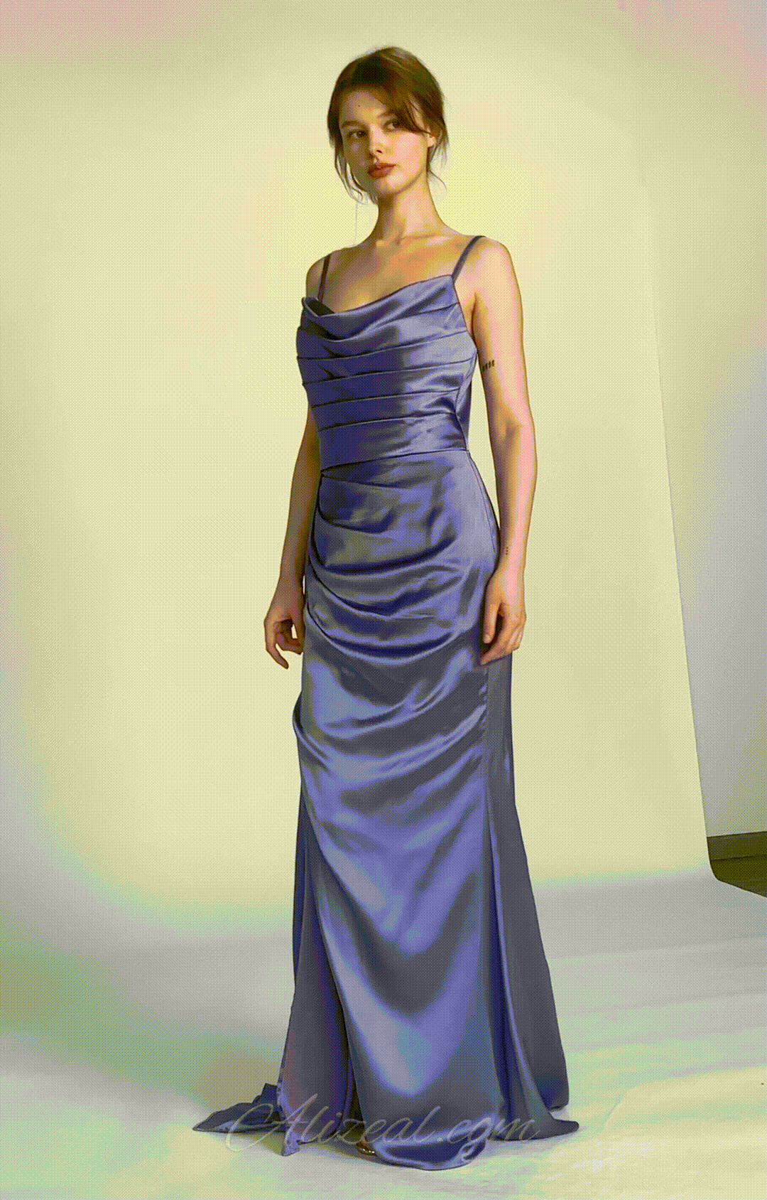 Cowl-Neck Pleated Side Slit Lace-Up Train Dresses