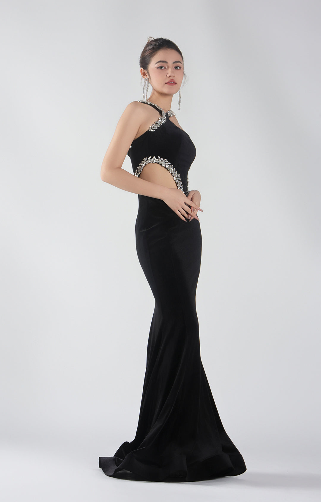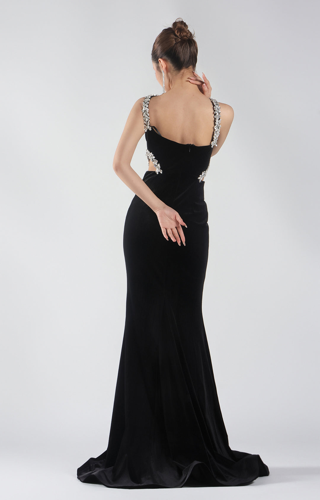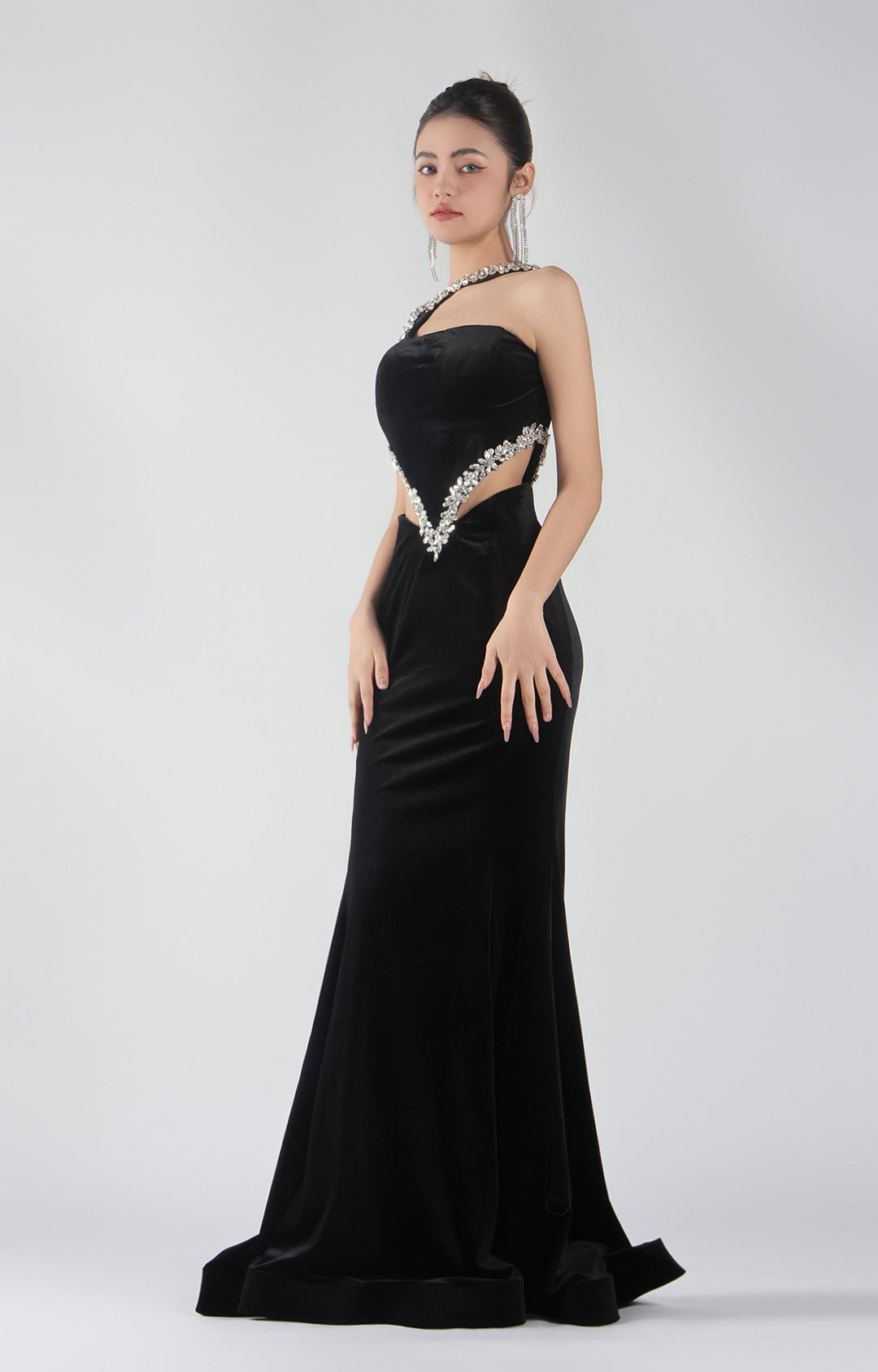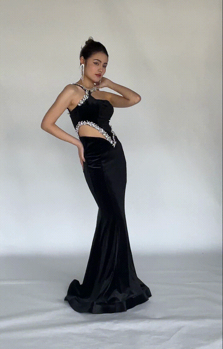 This glamorous gown is perfect for red carpet events, formal galas, black-tie weddings, or any occasion where a show-stopping entrance is a must. With its sculptural cut-outs and sparkling details, it balances bold modernity with timeless sophistication.