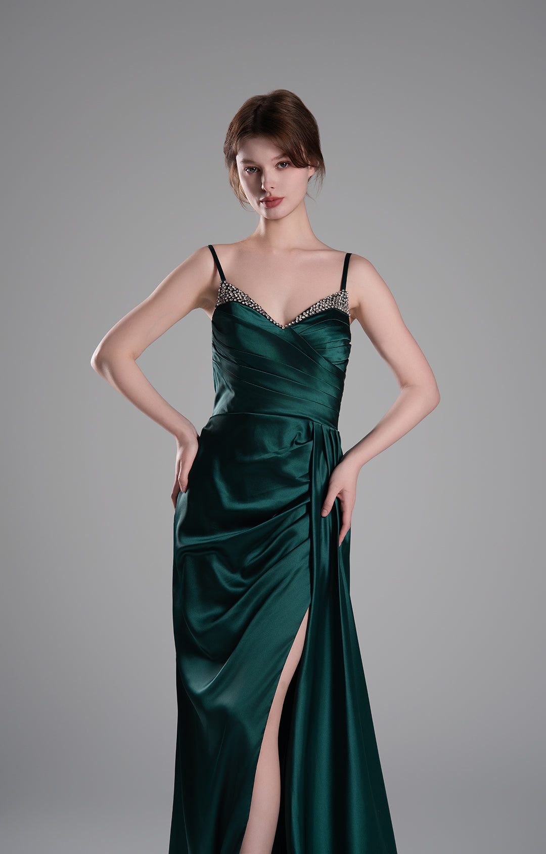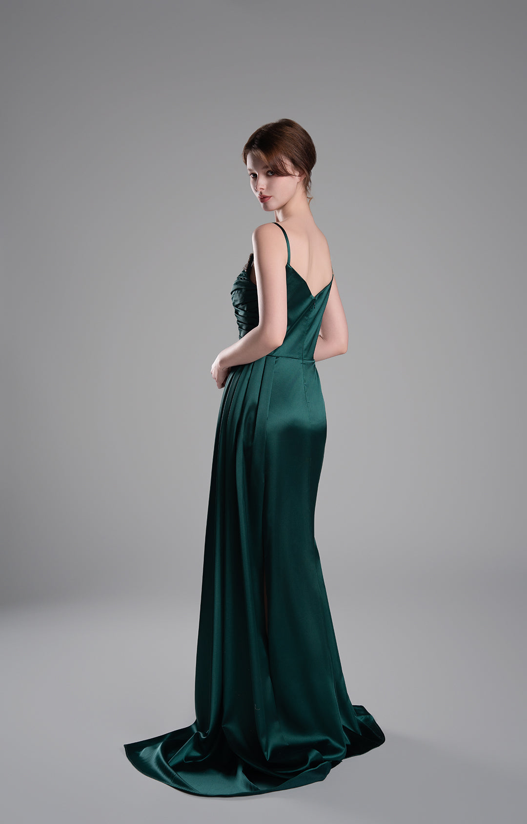 This gown is crafted from luxurious satin.