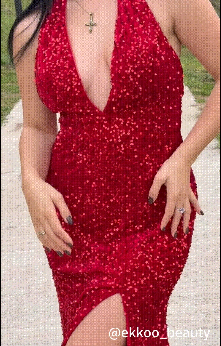 Halter Deep V-Neck Front Split Open Back Sparkling Dress