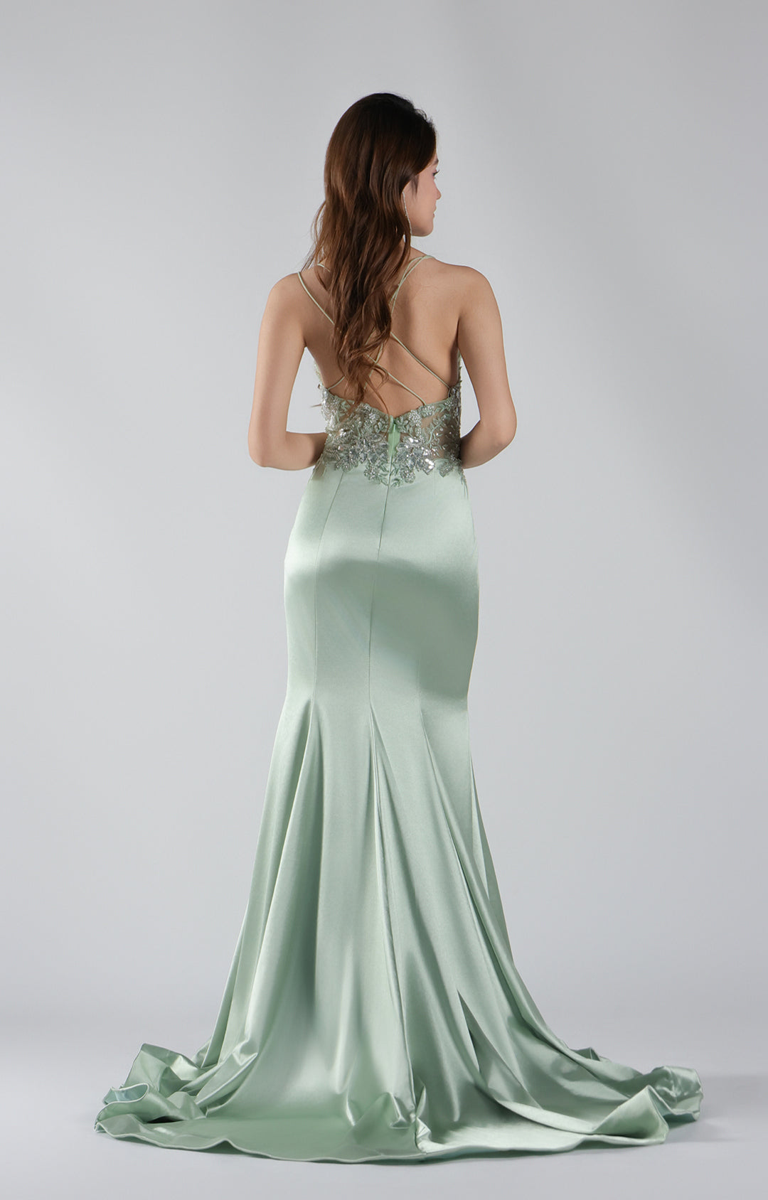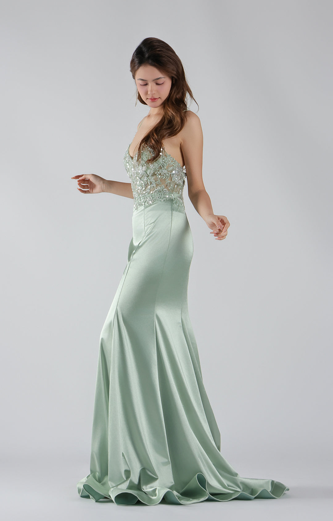Crafted from luxurious satin fabric, this gown features a silky-smooth texture with a natural luster. The satin drapes elegantly, creating a sophisticated, fluid silhouette that moves gracefully with every step.