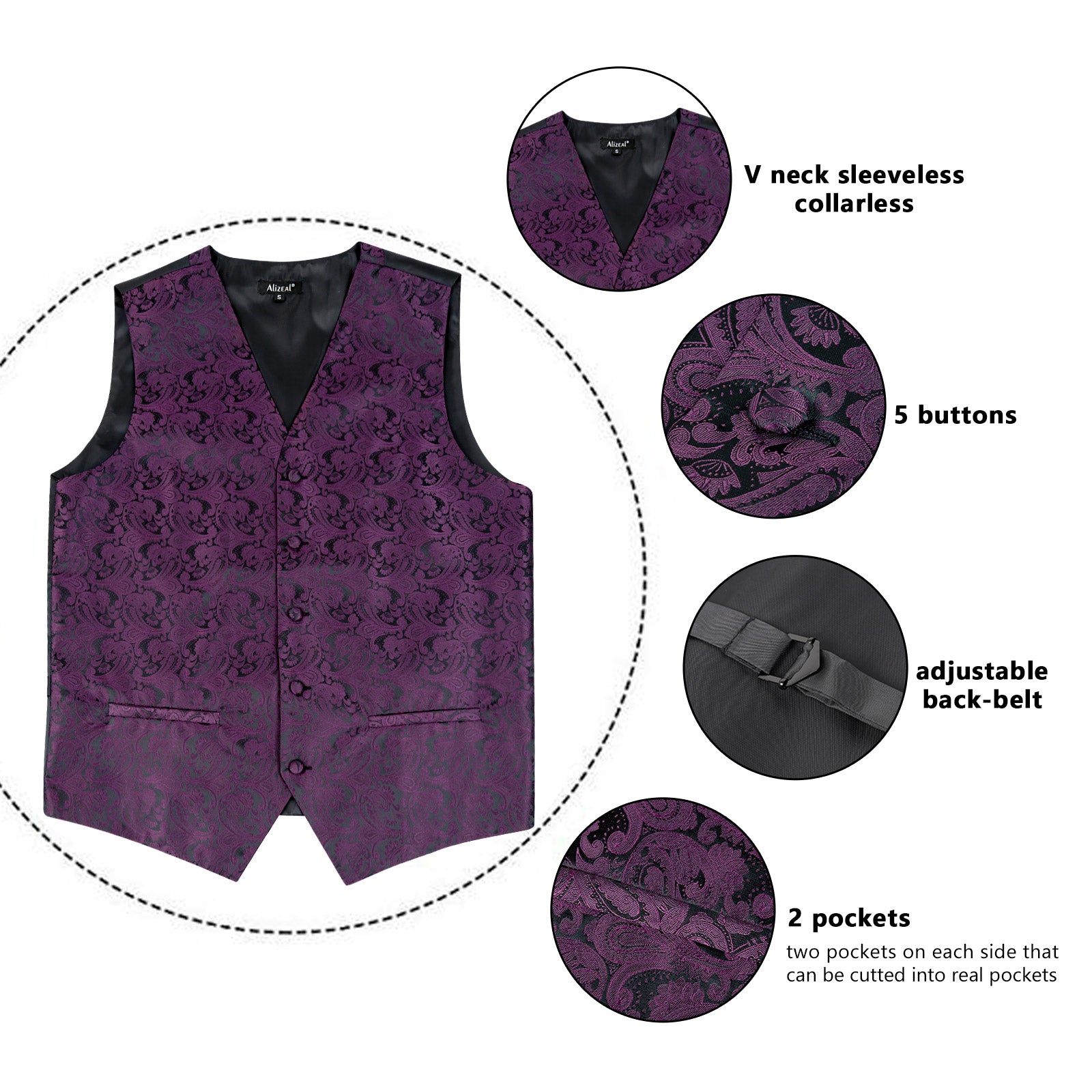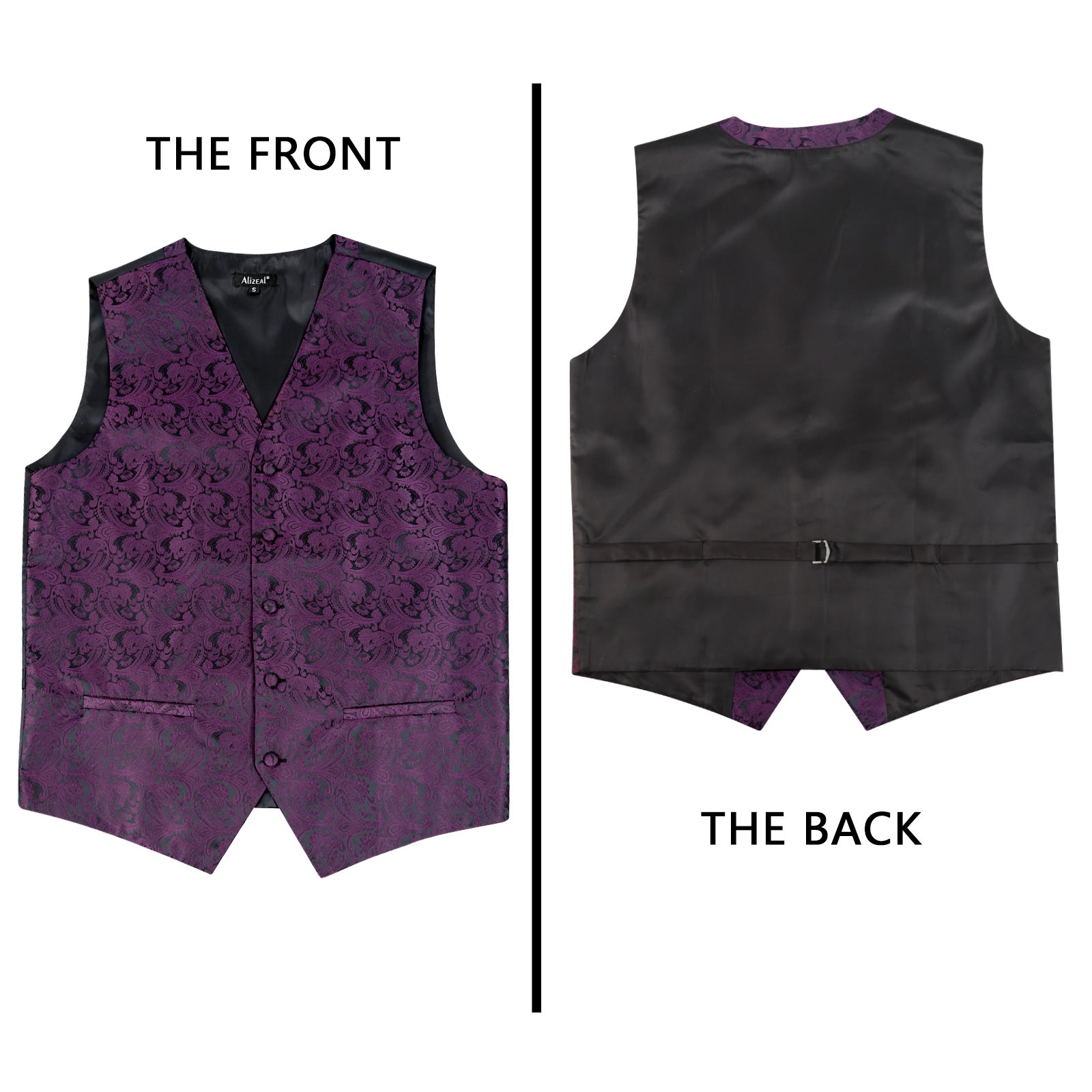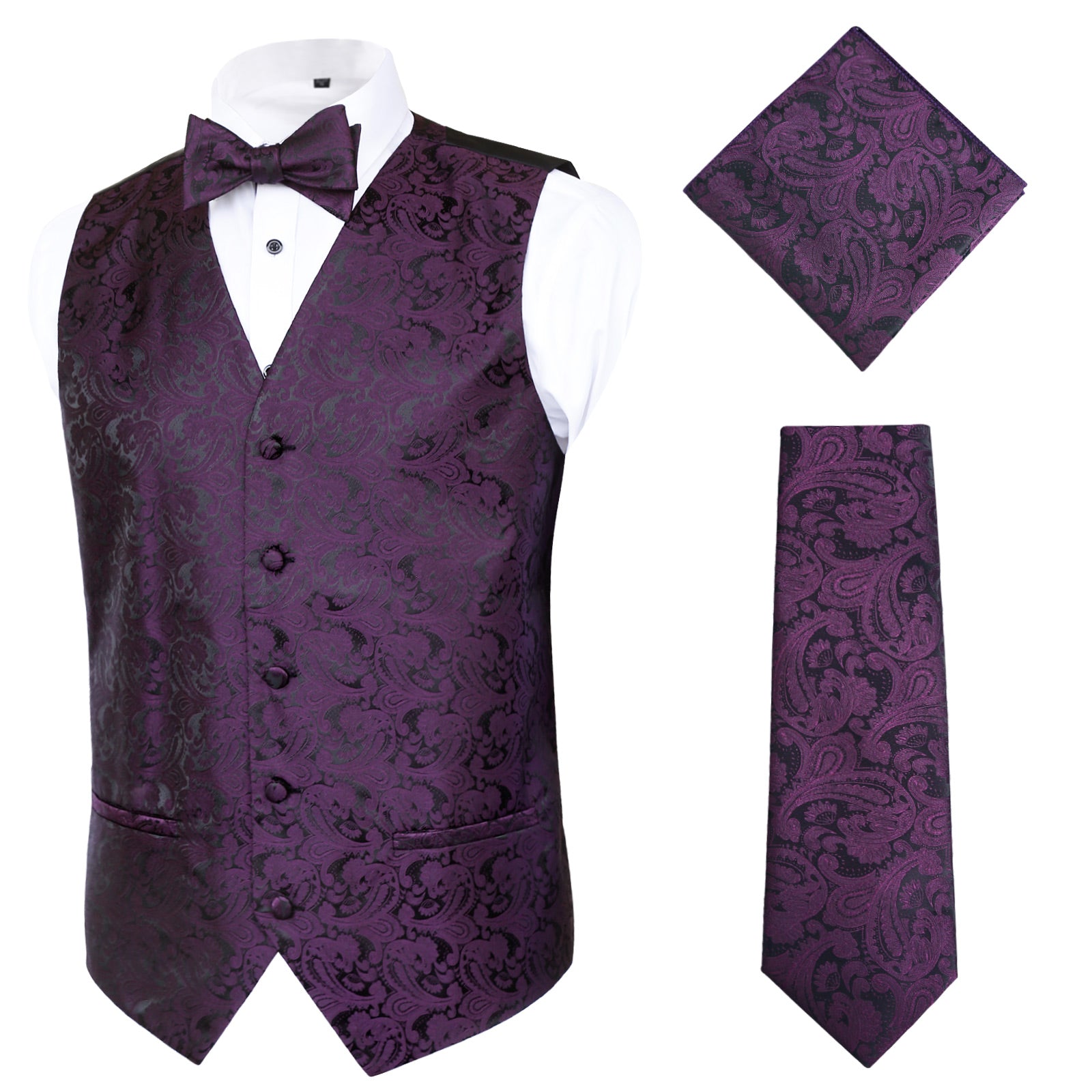 Men's Paisley Suit Vest, Self-tied Bow Tie, 3.35inch(8.5cm) Necktie and Pocket Square Set, 175-Eggplant