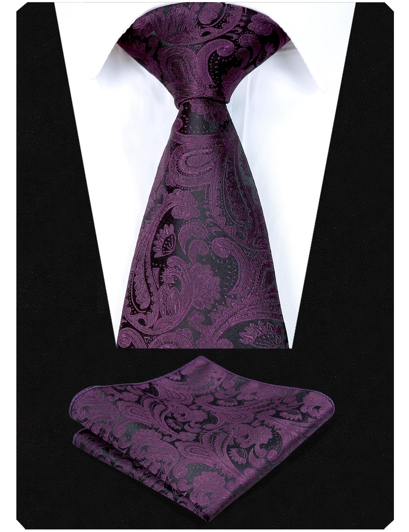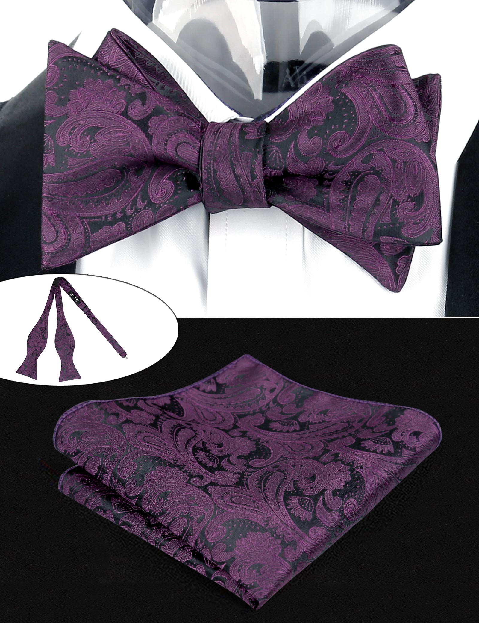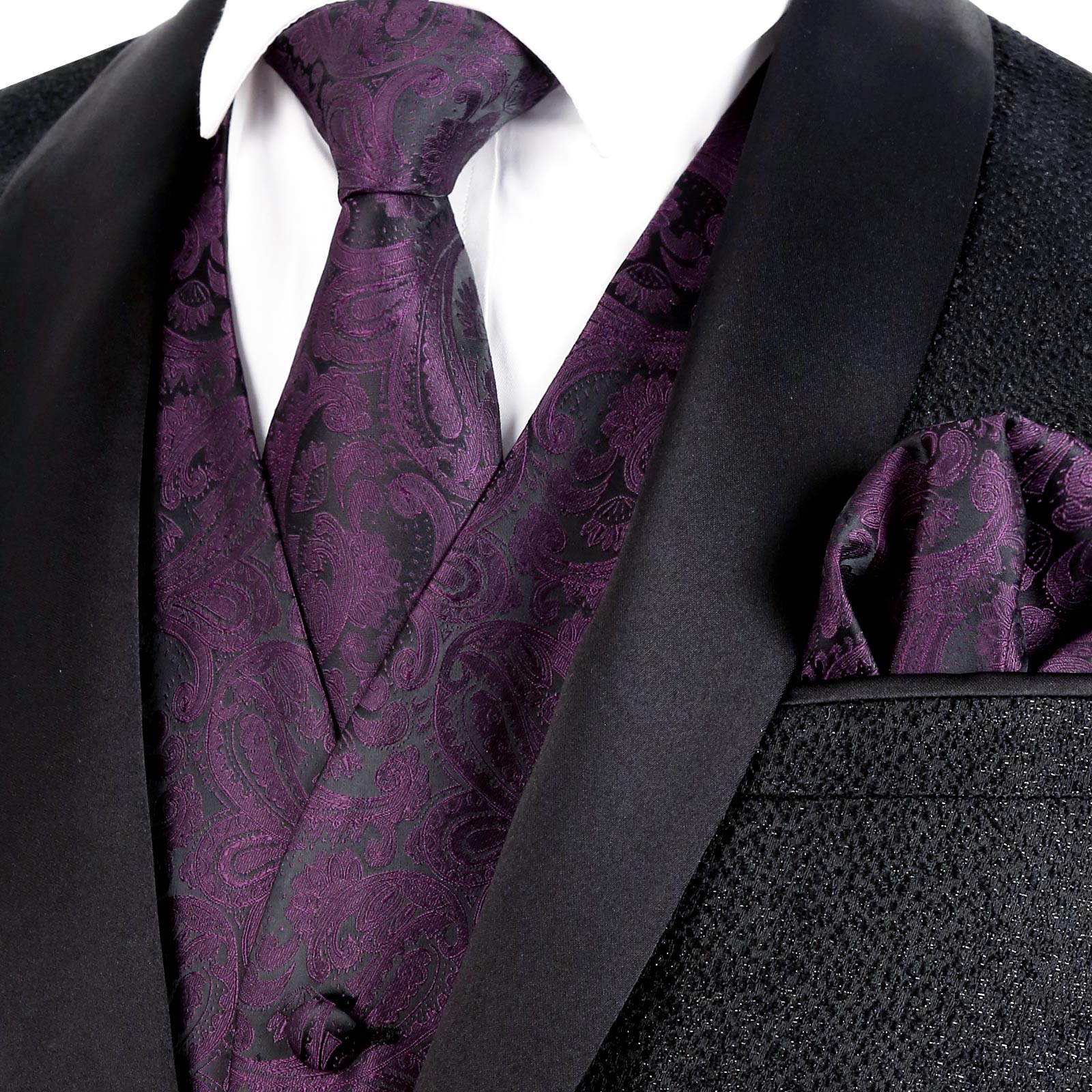 Men's Paisley Suit Vest, Self-tied Bow Tie, 3.35inch(8.5cm) Necktie and Pocket Square Set, 175-Eggplant