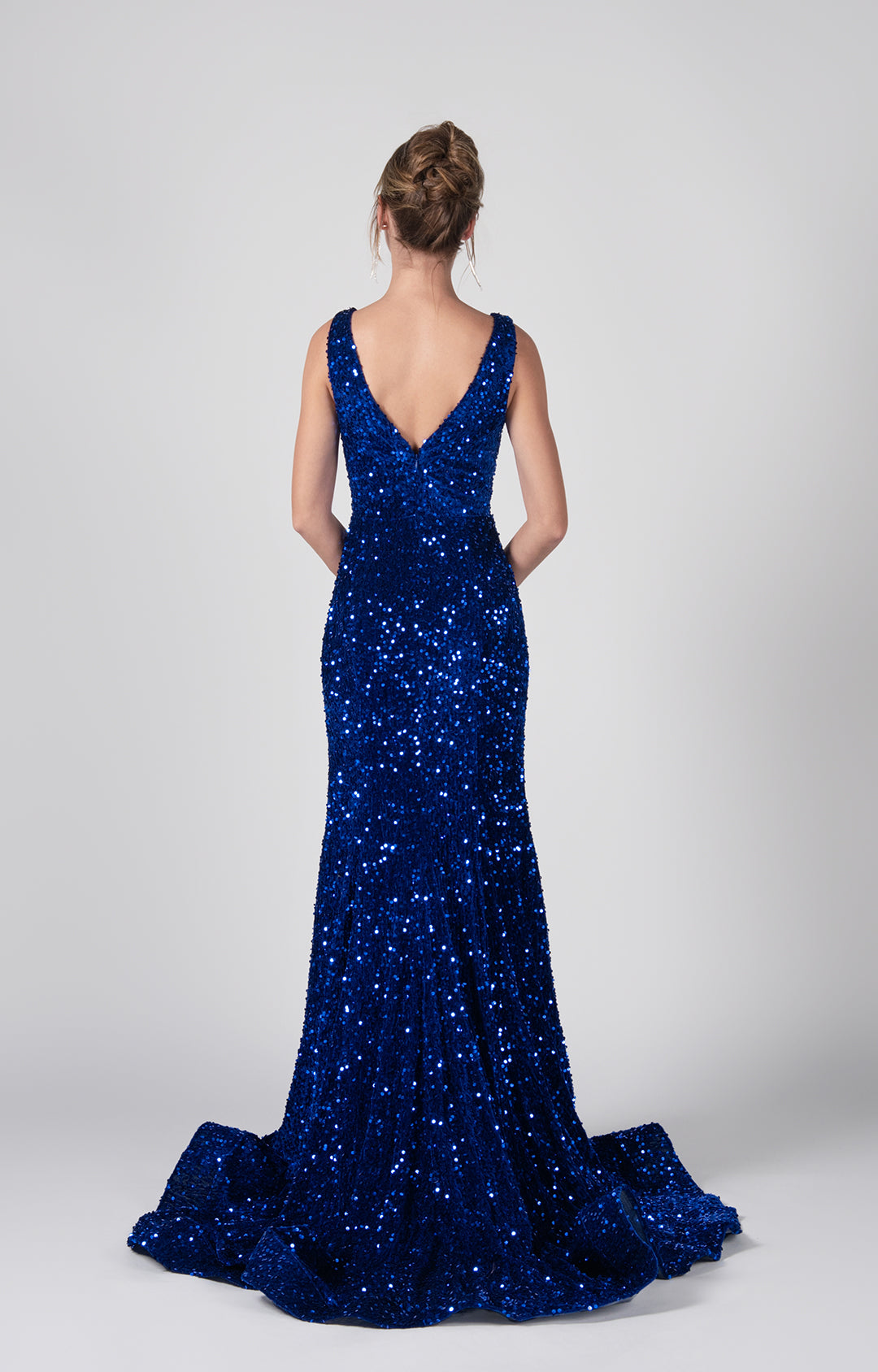 This glamorous gown is made from velvet fabric, adorned with sequins.