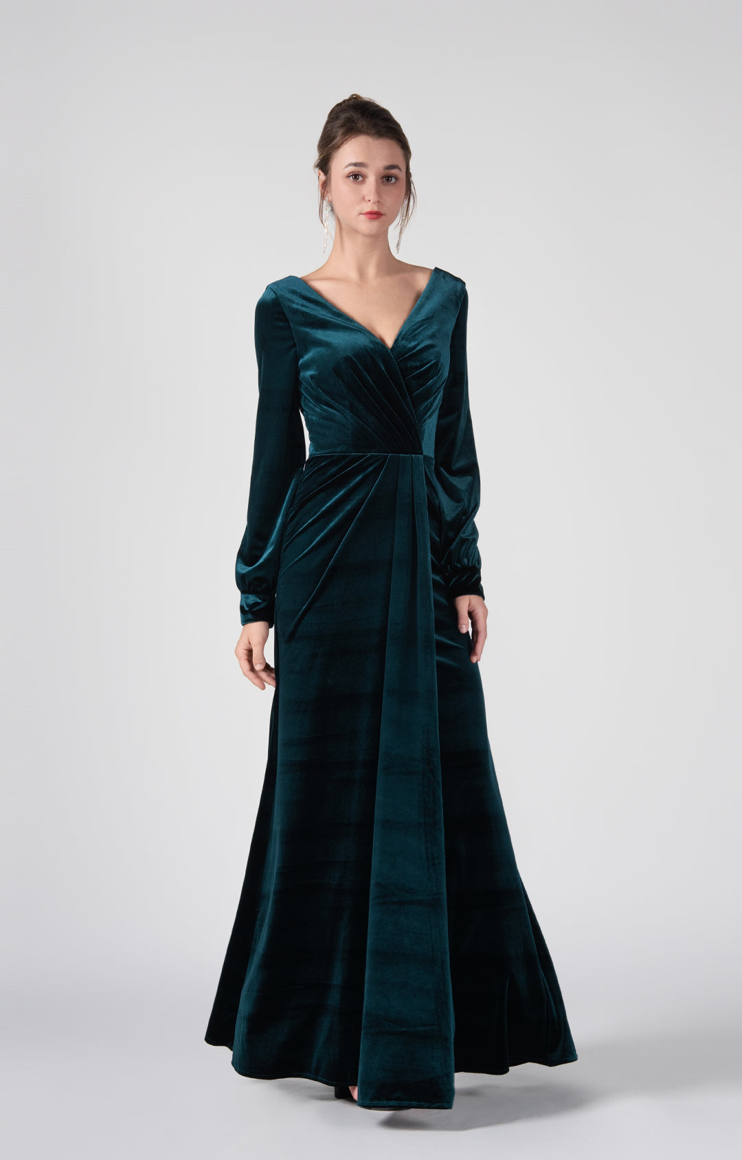 This luxurious evening gown is made from premium velvet fabric, offering a rich and soft texture. The velvet drapes beautifully, providing both comfort and a sophisticated shine, making it perfect for formal occasions.