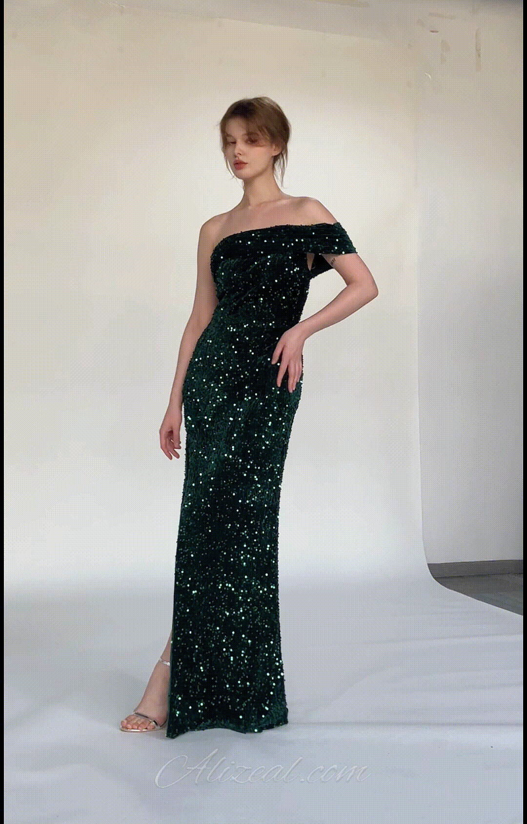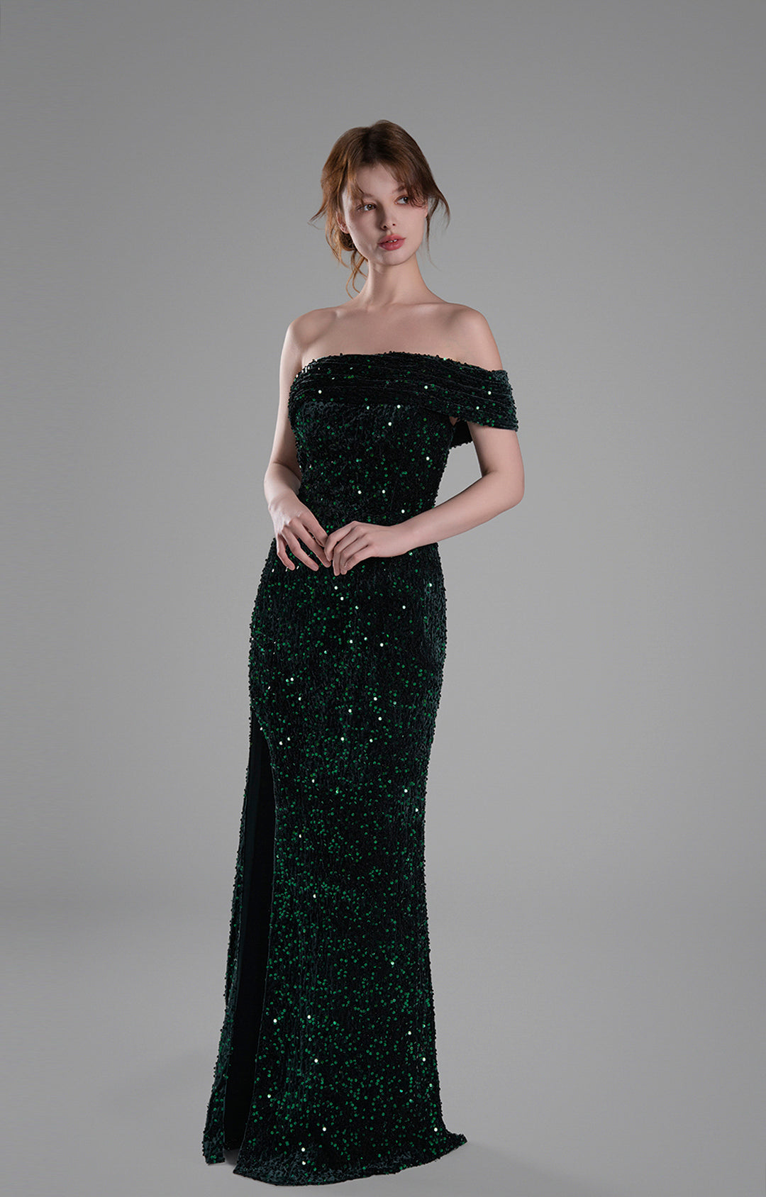 Crafted from luxurious velvet fabric adorned with shimmering sequins, this gown combines opulence with a touch of glamour.