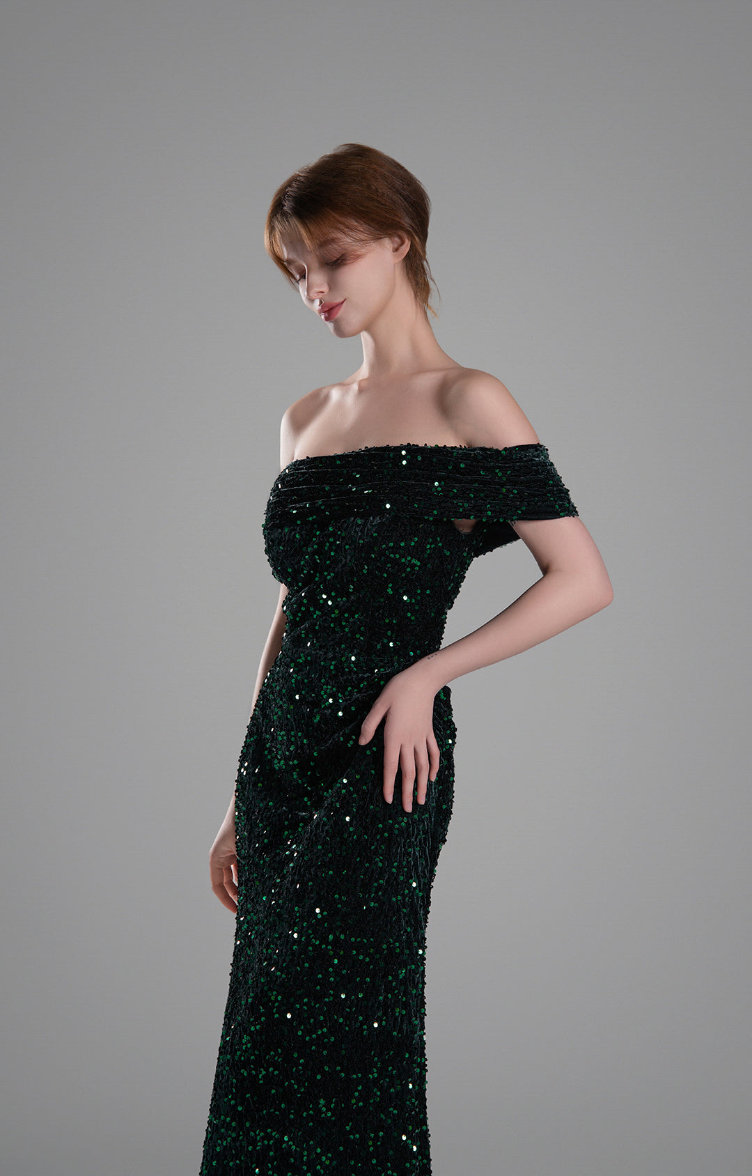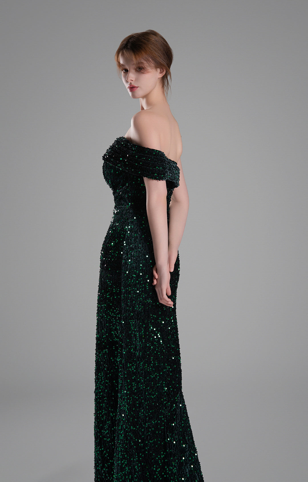 Off-Shoulder Draped Bodice Sequins Sweeping Dresses