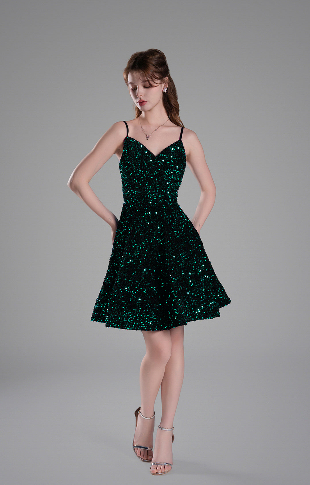 Crafted from velvet adorned with shimmering sequins, this dress offers a stunning combination of elegance and sparkle.