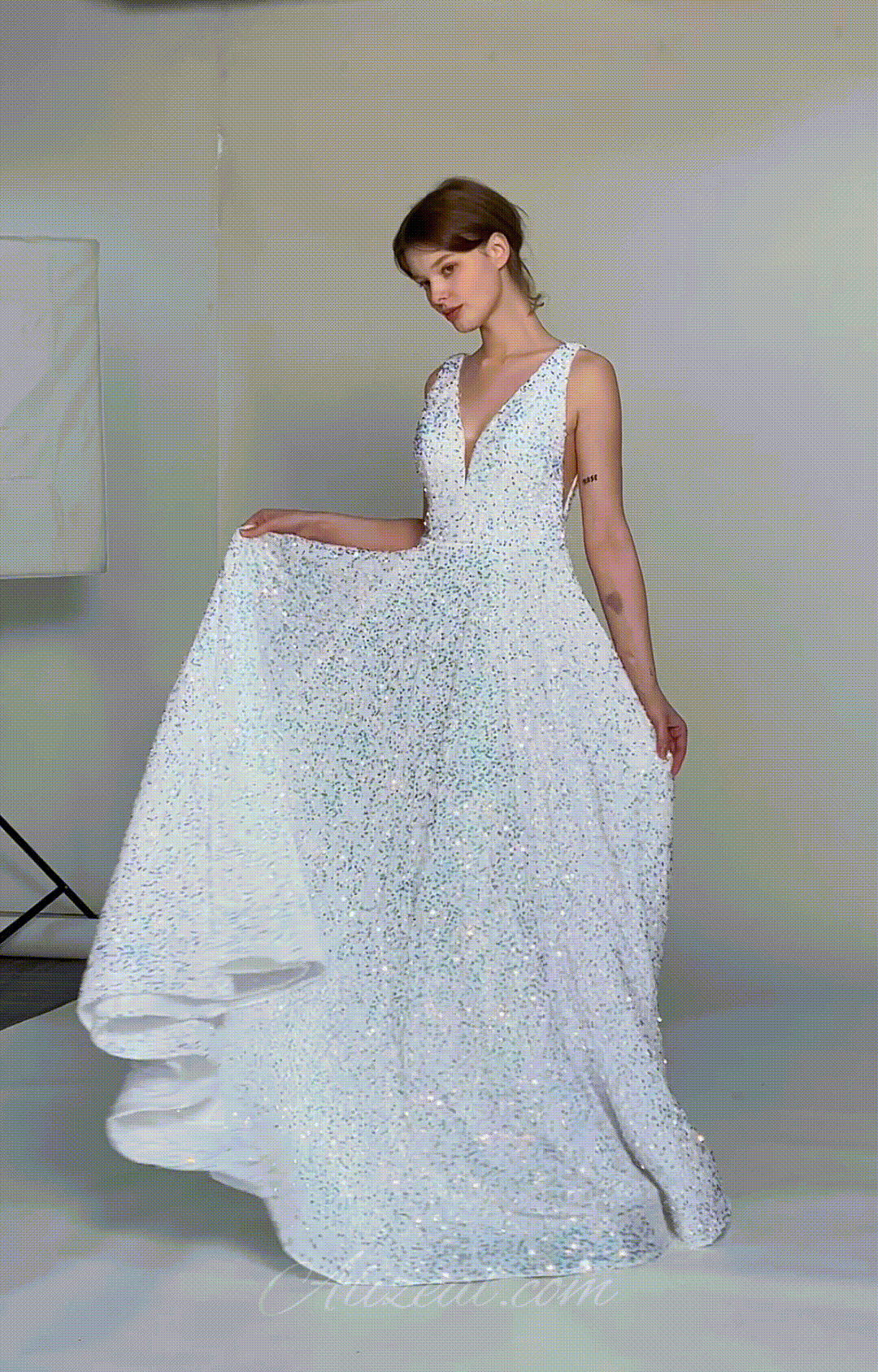 V-Neck Shimmering Low-Cut Back A-Line Dresses