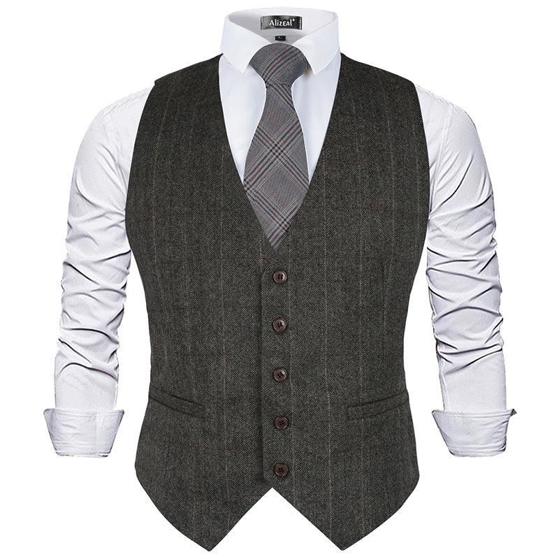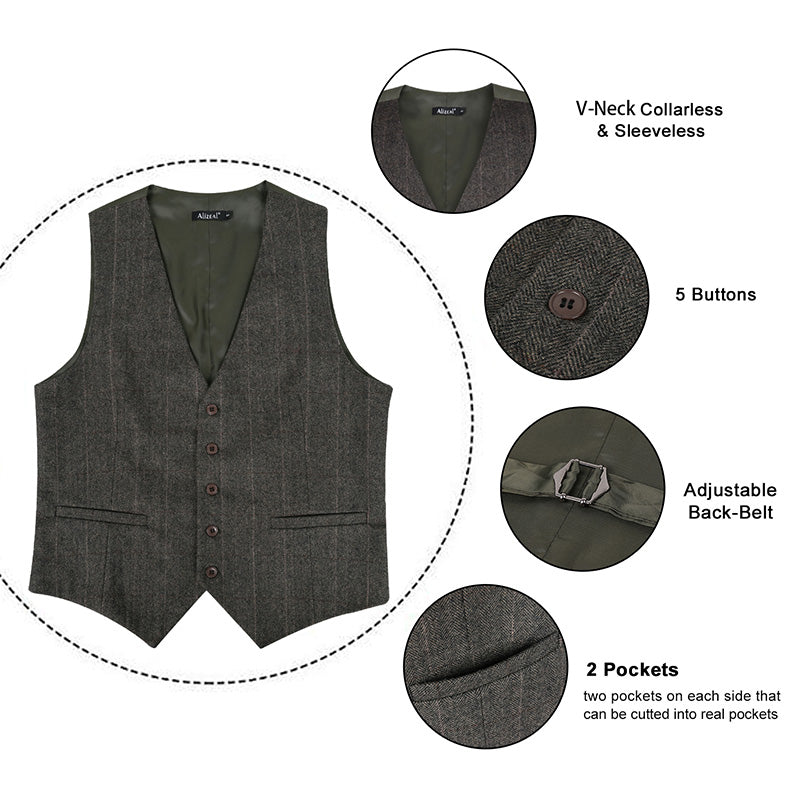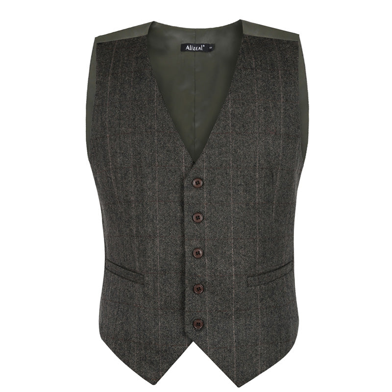 Mens Plaid Tweed Business Suit Vest Regular Fit Tuxedo Waistcoat, 193-Dark Olive