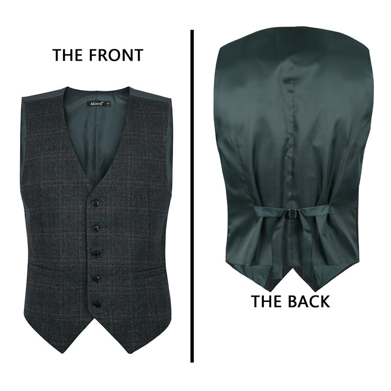 - DESIGN: classic color with plaid, V-neck Collar, 5 buttons, and adjustable back buckle strap; two pockets on each side can be cut into real pockets