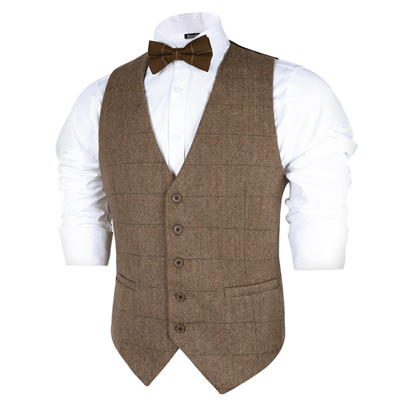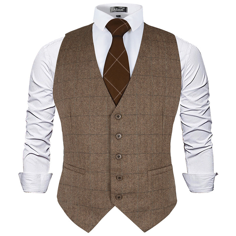 Mens Plaid Tweed Business Suit Vest Regular Fit Tuxedo Waistcoat, 193-Brown