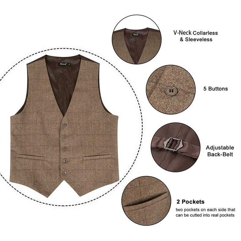 Create a stylish look with this classic brown plaid suit vest. You can pair it with the matching jacket and slacks, and the satin back and adjustable belt help you create the perfect coordinated look and adjust it to your desired range.