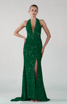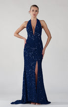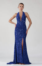 Halter Deep V-Neck Front Split Open Back Sparkling Dress