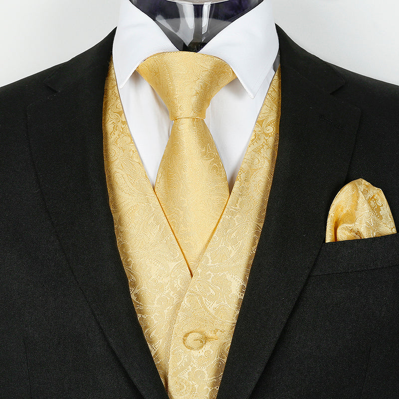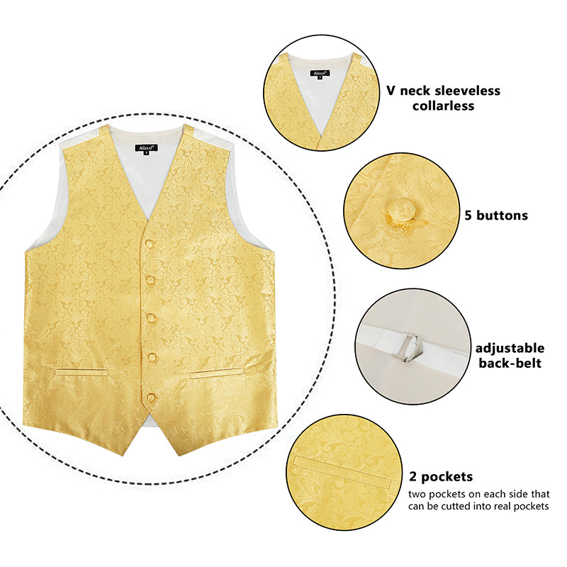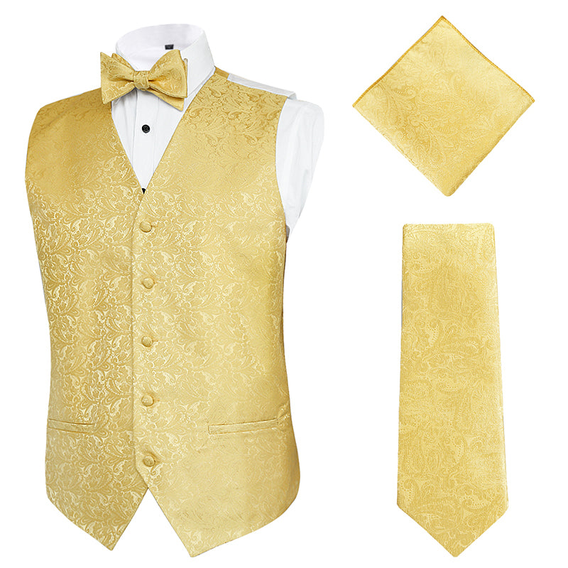 Add distinctive style to your tuxedo suit or casual suit with this gold paisley vest and tie set. This gold vest is handcrafted from a durable, non-deformable polyester fabric with a gold paisley pattern. It comes with a matching gold paisley self-tied bow tie, pocket square, and tie. You'll be the center of attention at any event with ease.