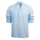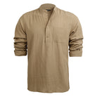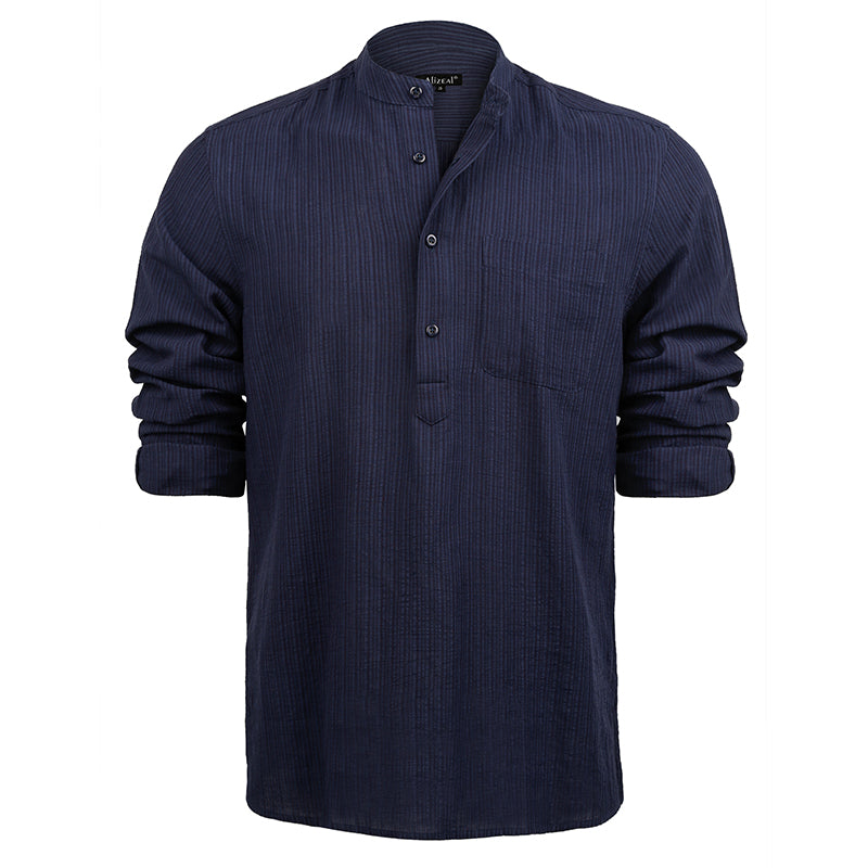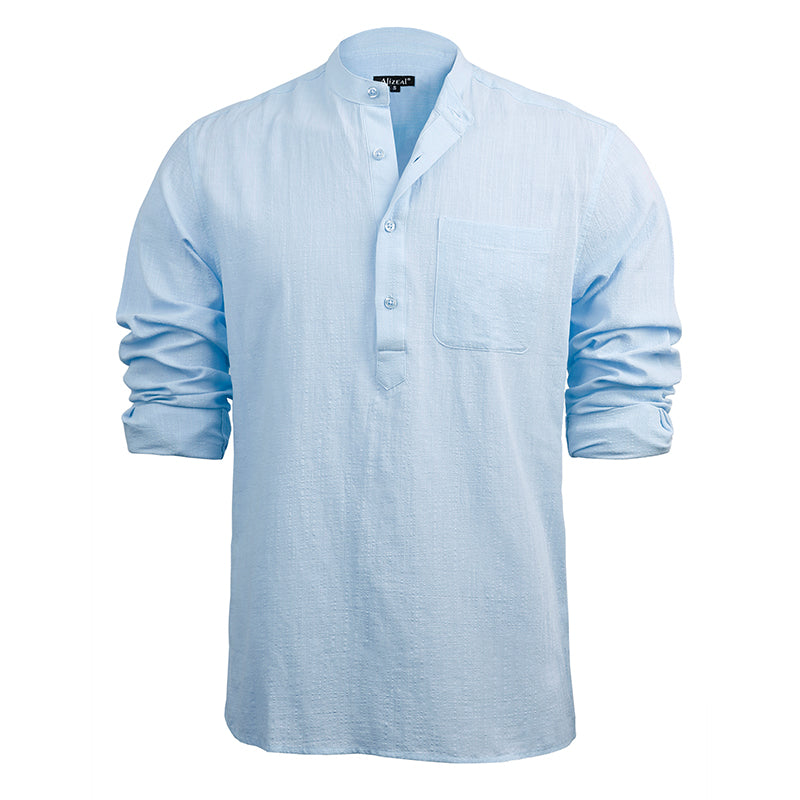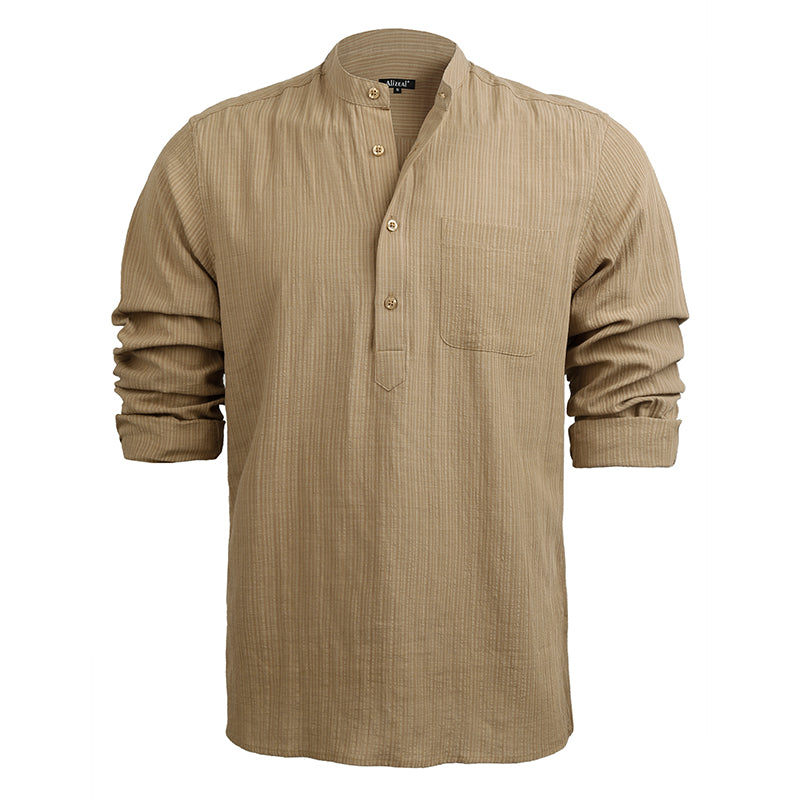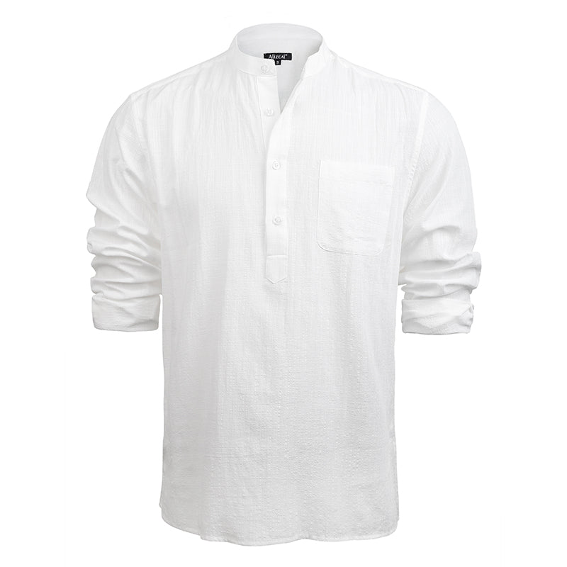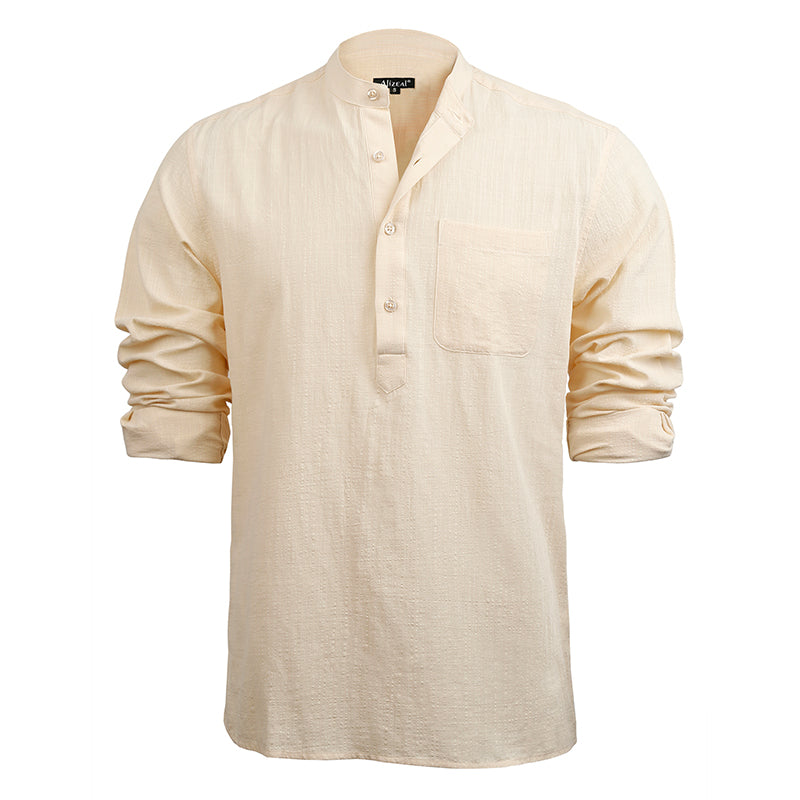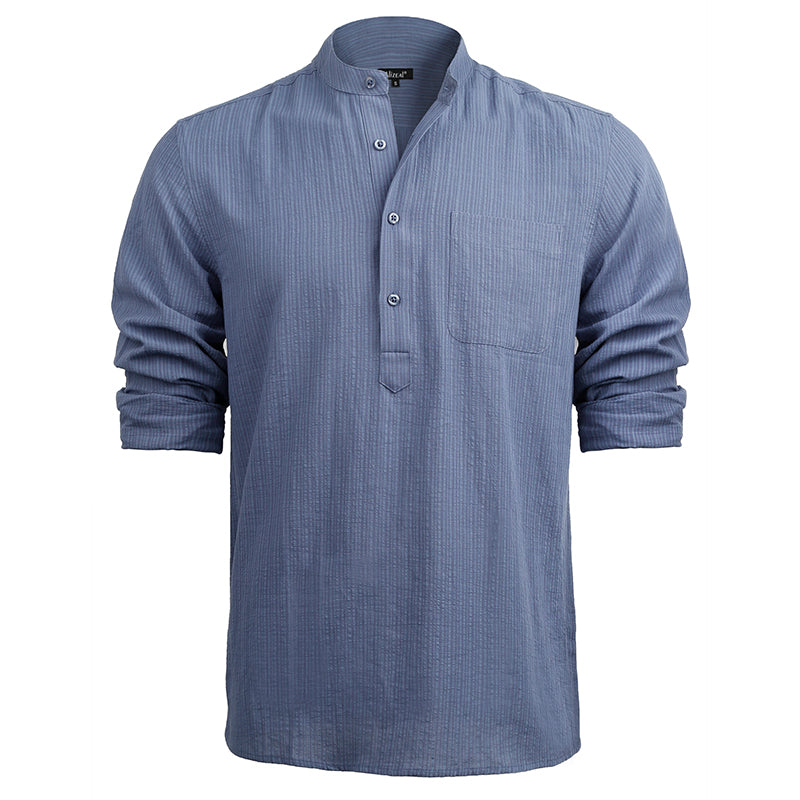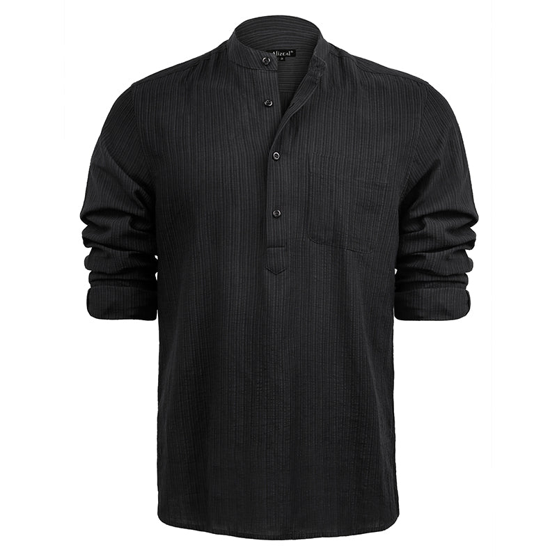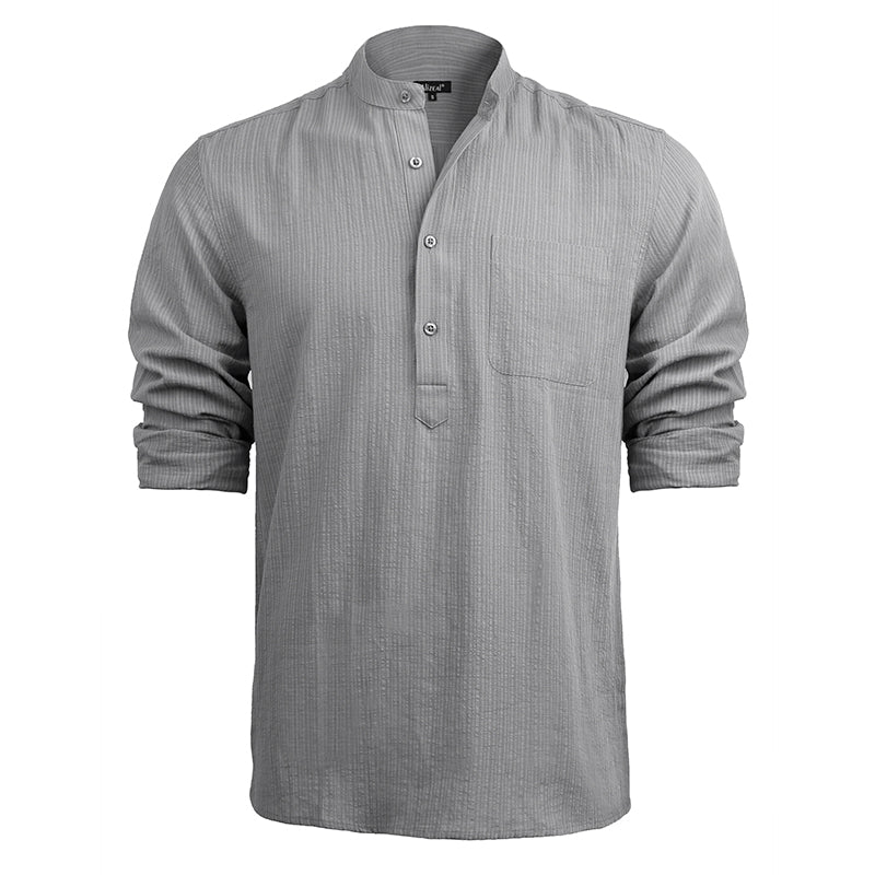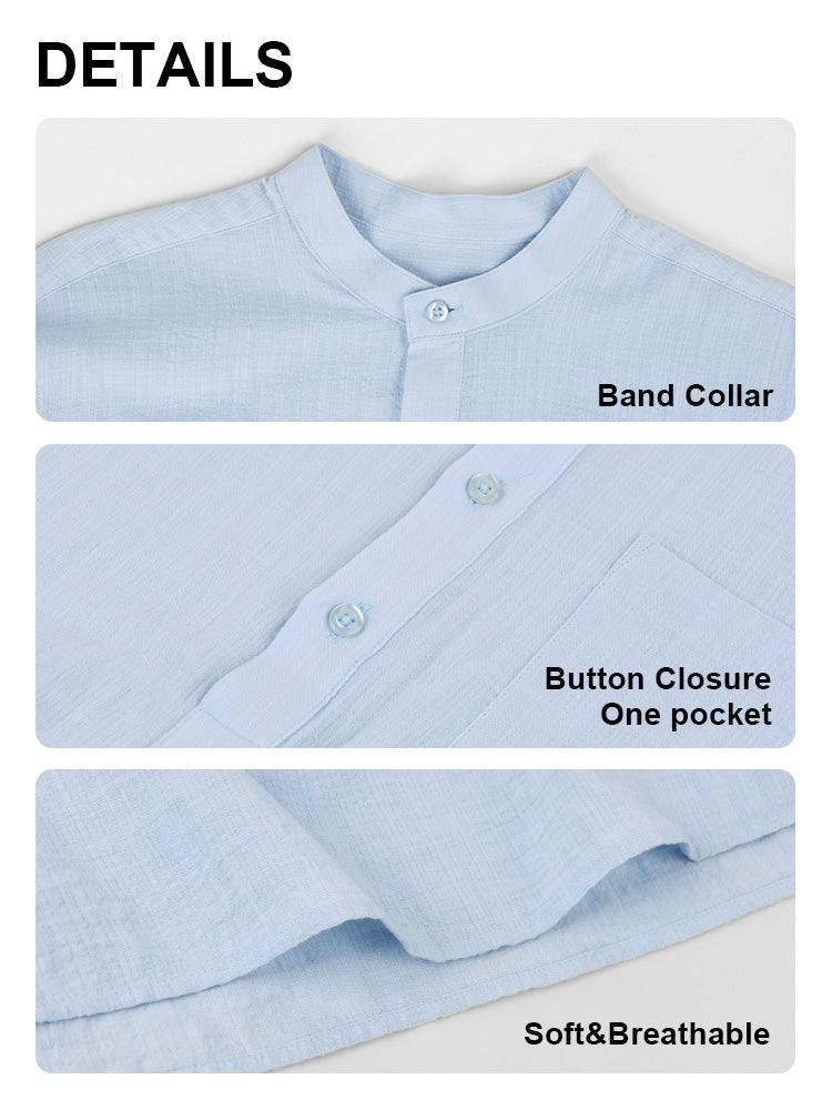 - DESIGN: Cotton and viscose fabric, looking textured and high quality, band collar, long sleeve, button-down closure, 4 buttons of the same color of the shirt, solid color, casual and simple, breathable and retro fashion, better ventilation, easy to wear