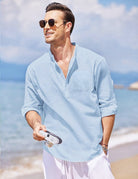Men's Henley Shirt Long Sleeve Cotton Viscose Solid Button-Down Casual Beach Shirt with Pocket-102