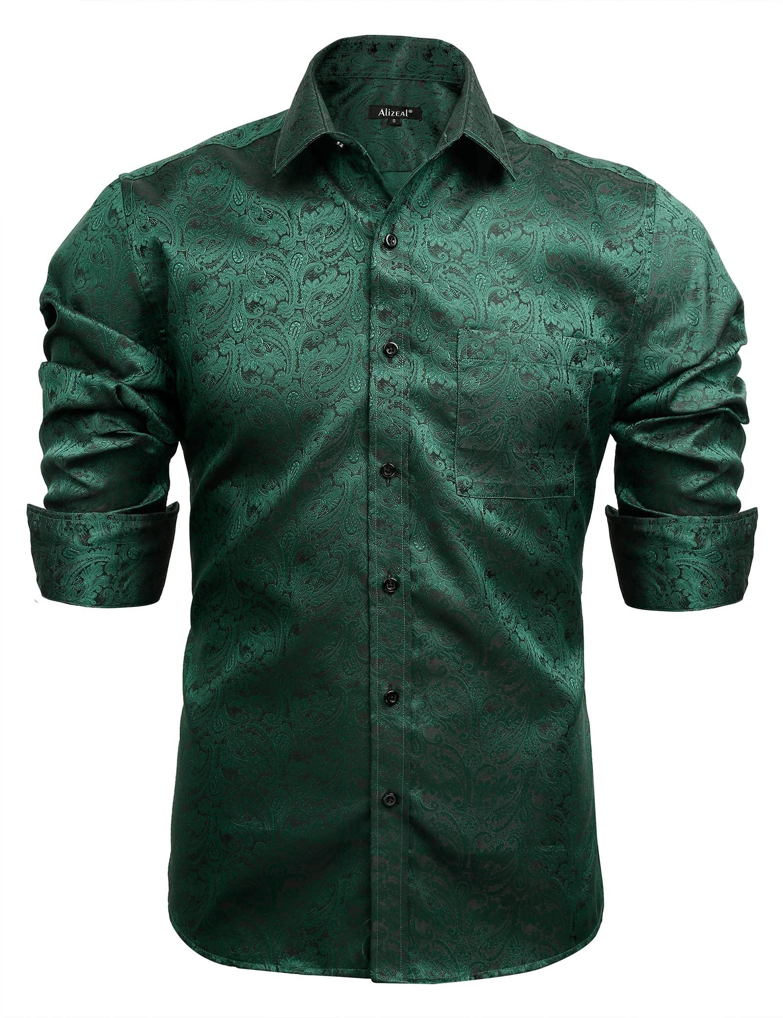 Men's Paisley Jacquard Dress Shirt Classic Slim Fit Button-Down Long Sleeve Shirt, 113-Dark Green