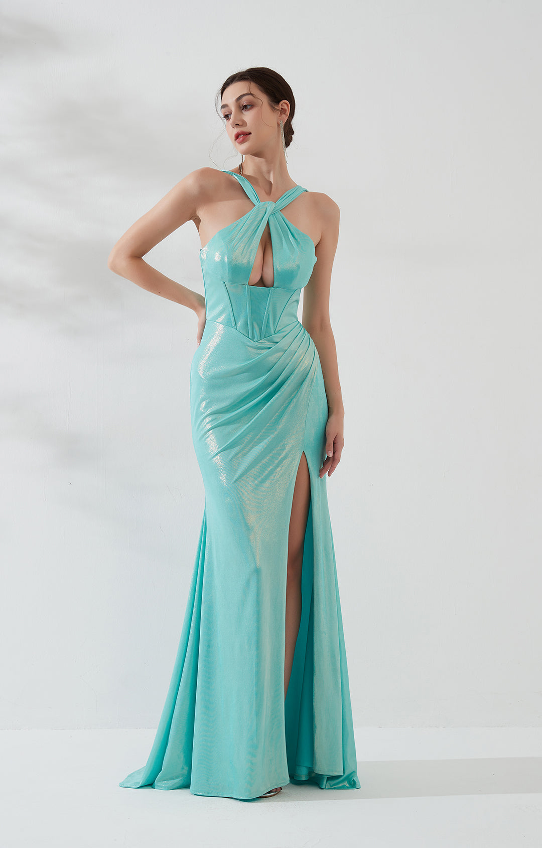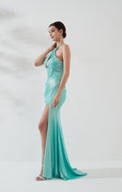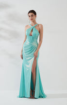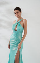 Wide Straps Halter Cut-out Pleats High Split Sheath Evening Dress