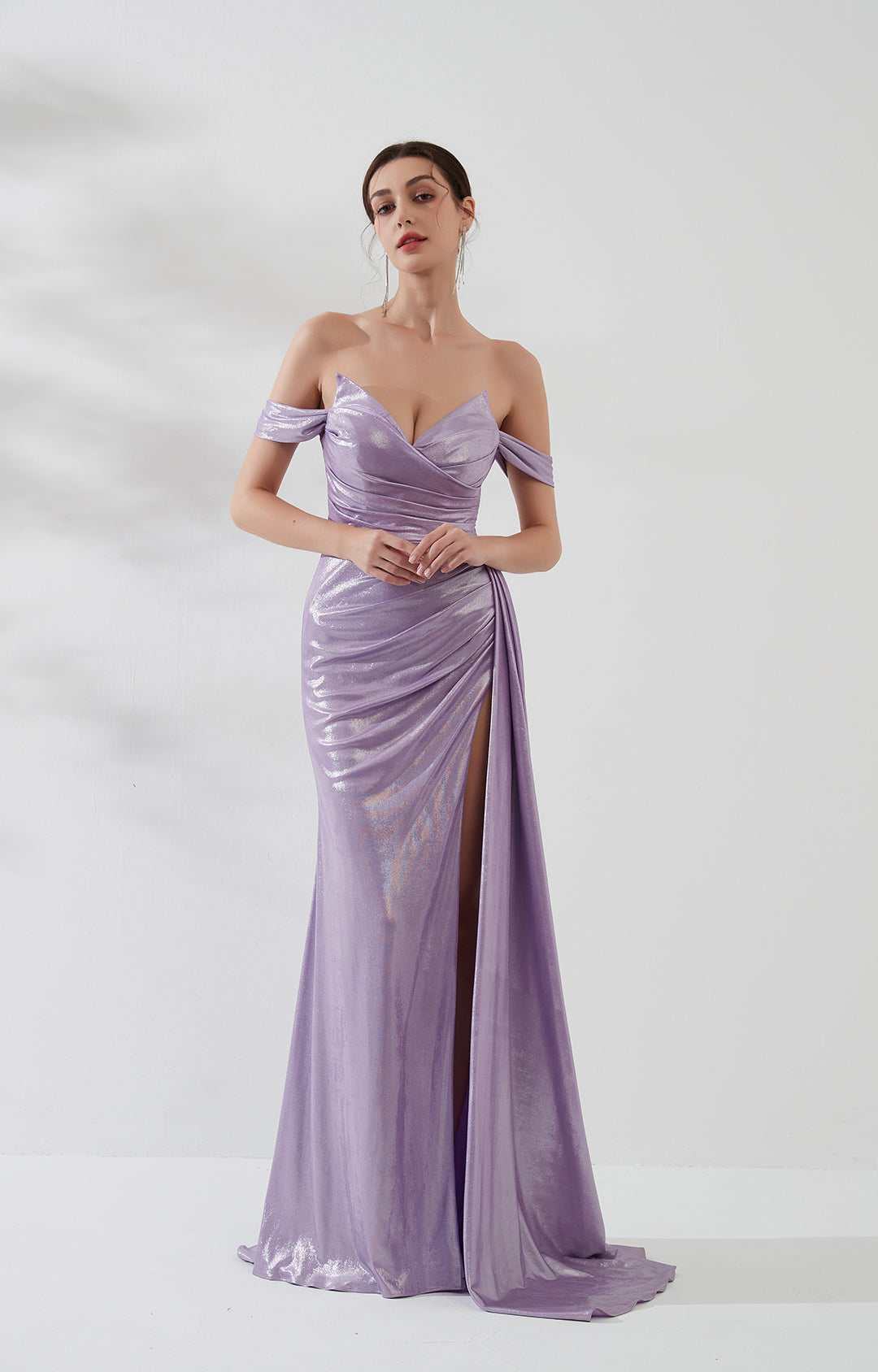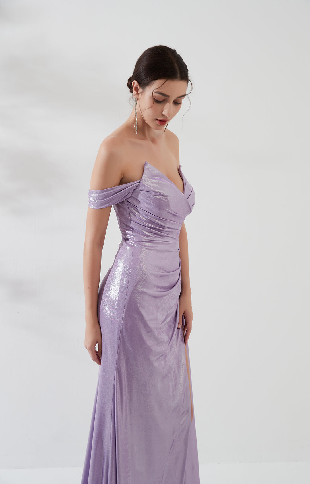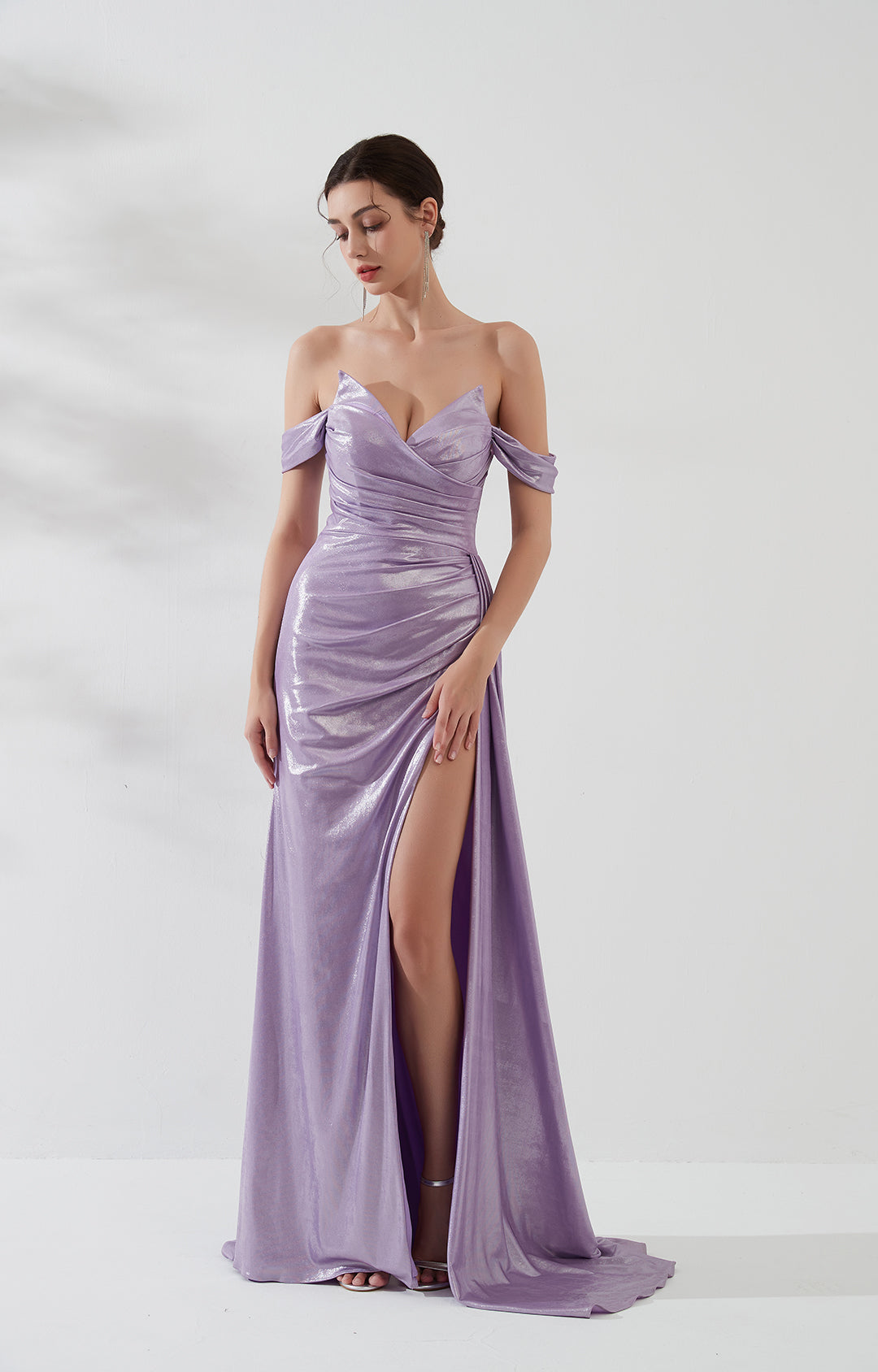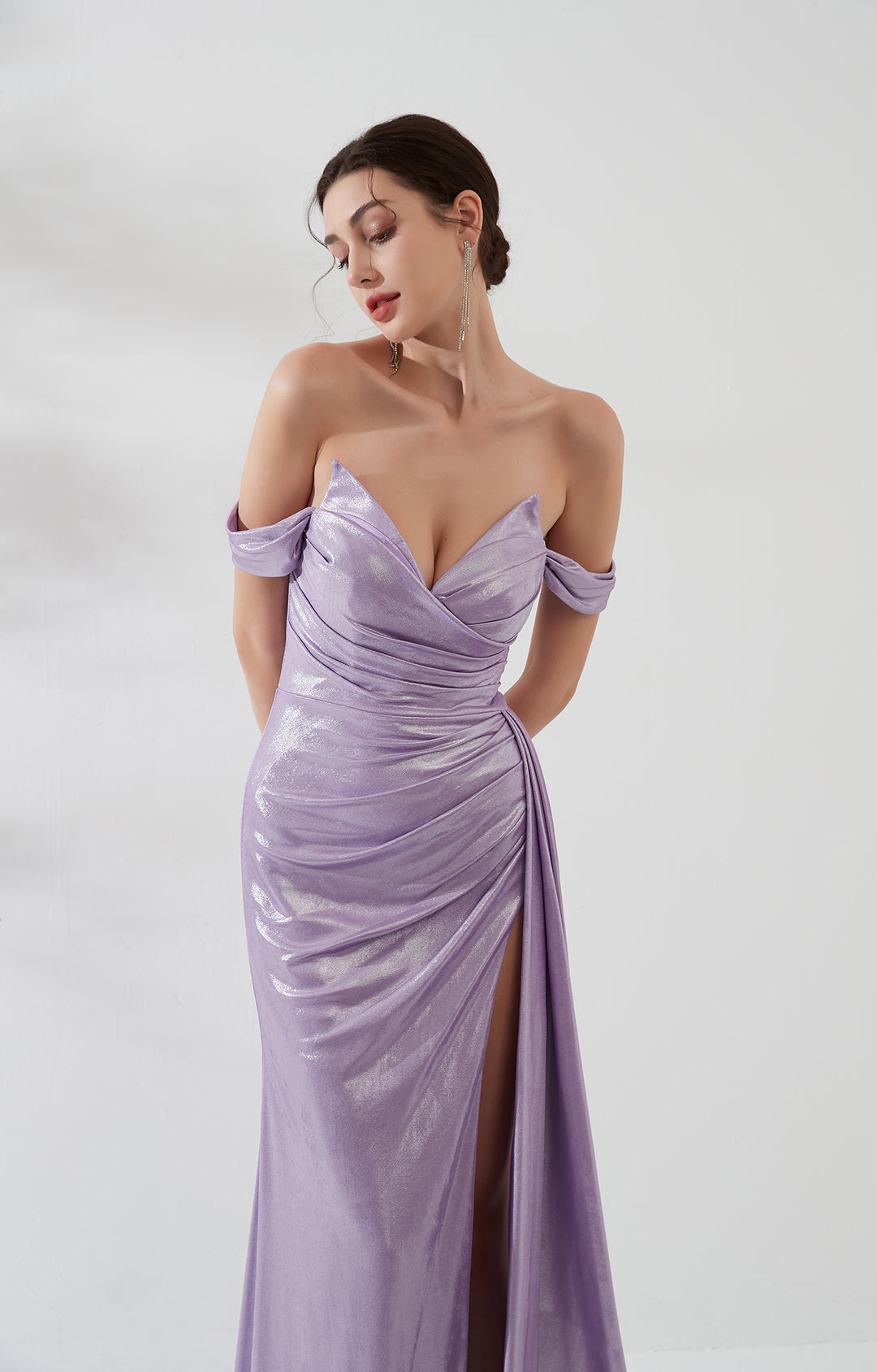 With its deep V-neck, dropped shoulder sleeves and high split design, this dress is suitable for all kinds of grand occasions. Its elegant floor-length skirt is suitable for formal occasions such as graduation balls, showing the wearer's nobility and charm.