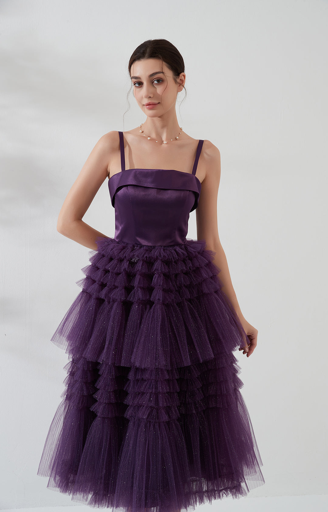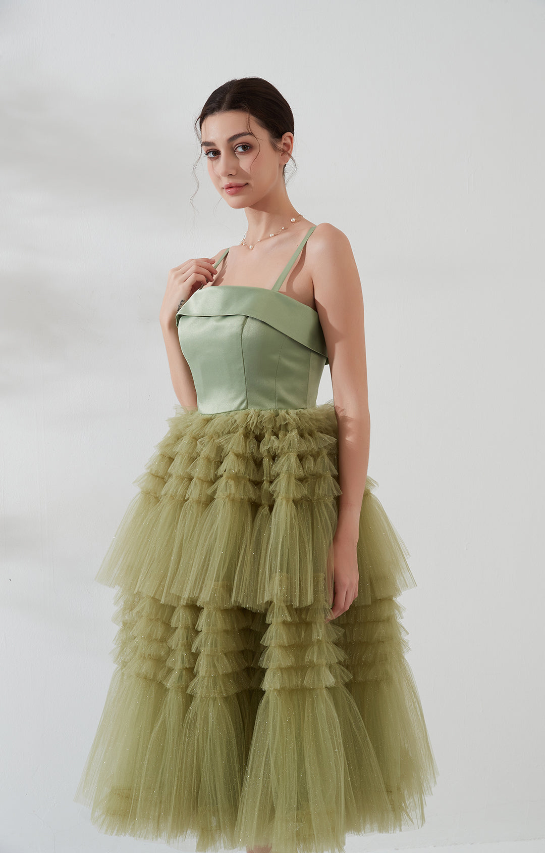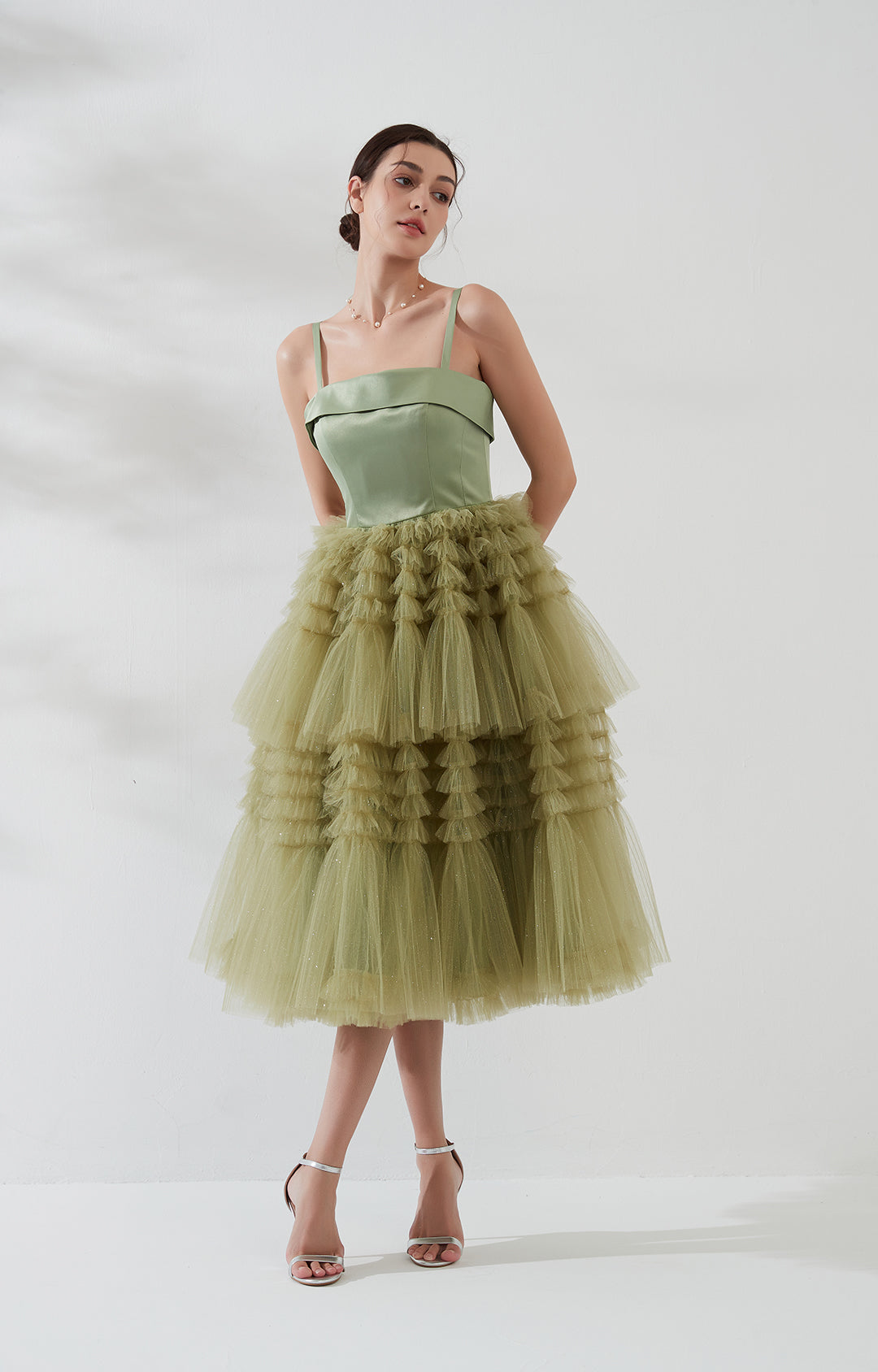 Square-Neck Spaghetti Straps Satin Mesh Patchwork Mid-Calf Cake Dresses