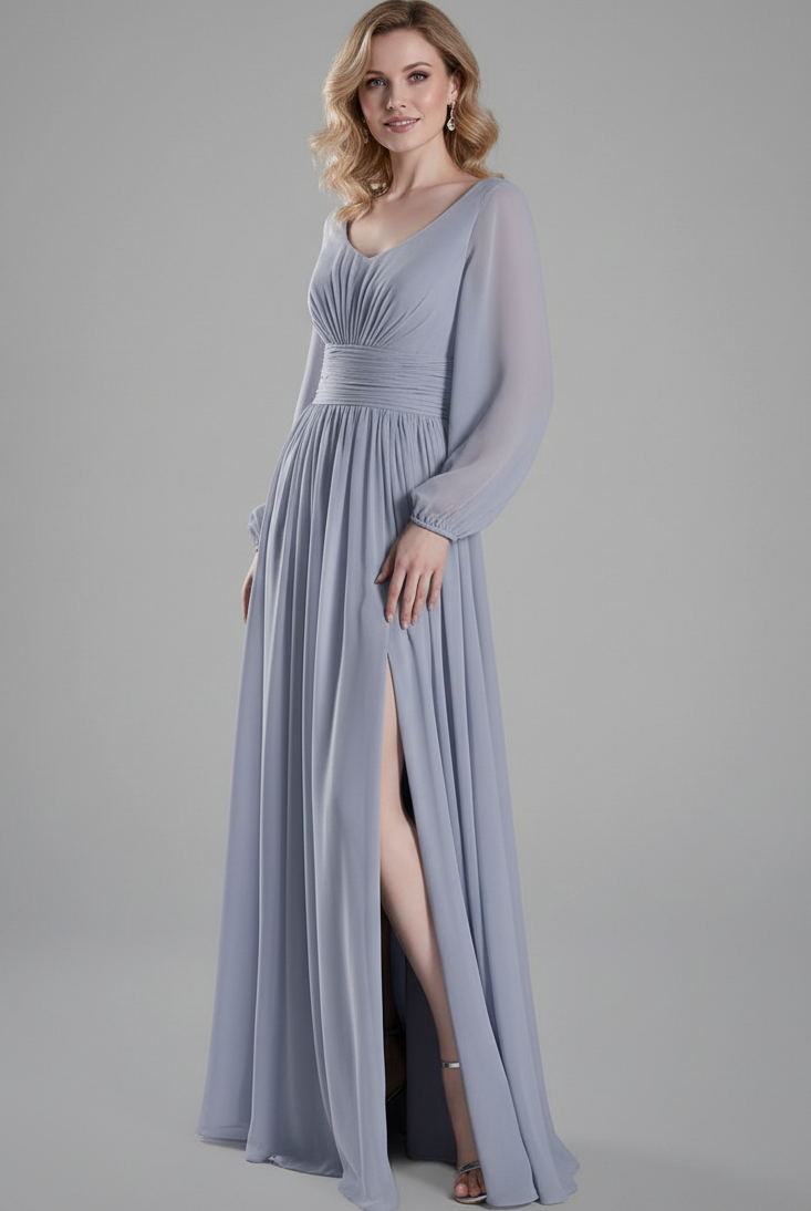 10 avaliaçõesLong Sheer Sleeves V-Back Pleated Slit Dresses