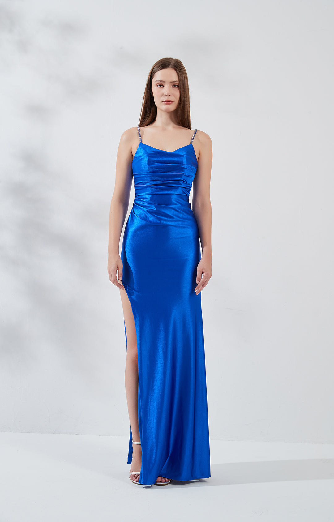 Beaded Spaghetti Strap Ruched Neckline High Split Dress