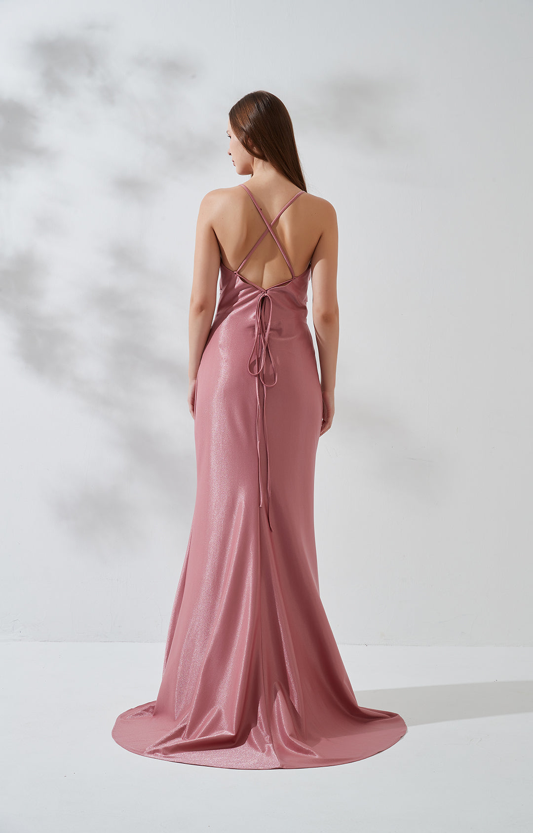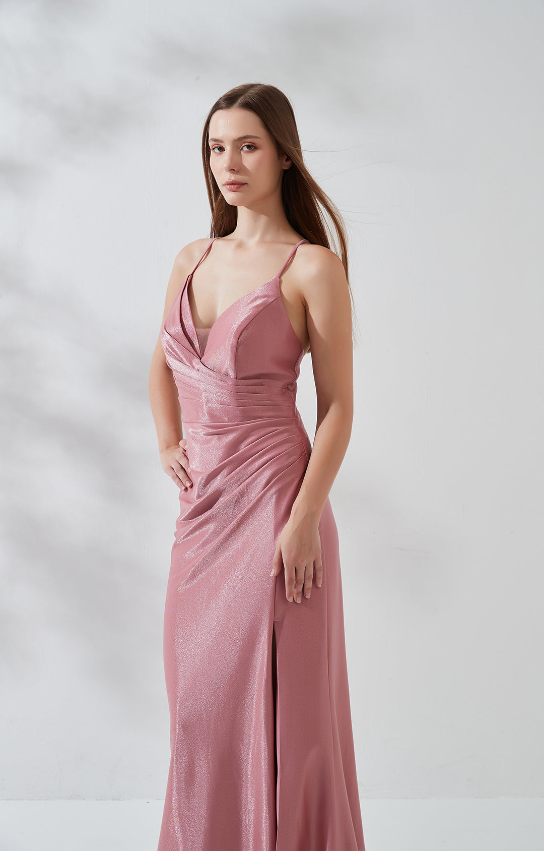Stretchy V-Neck Slant Pleated Split Cross Strap Evening Dress