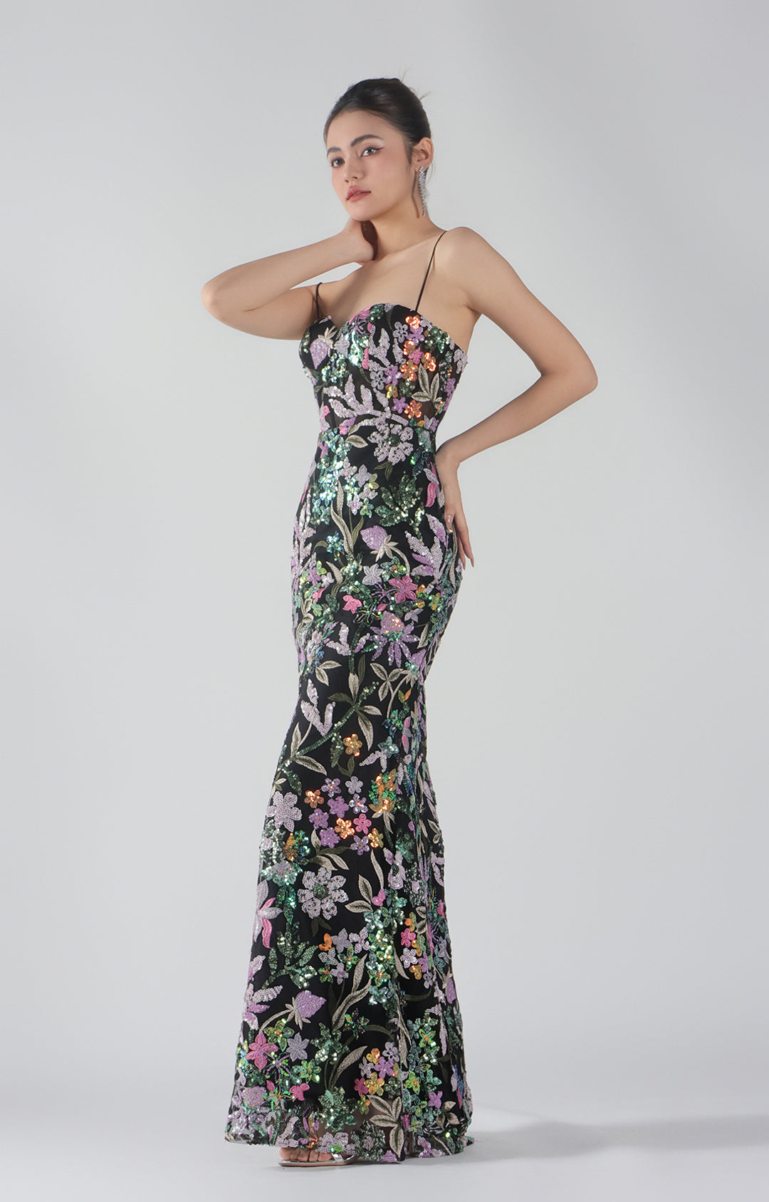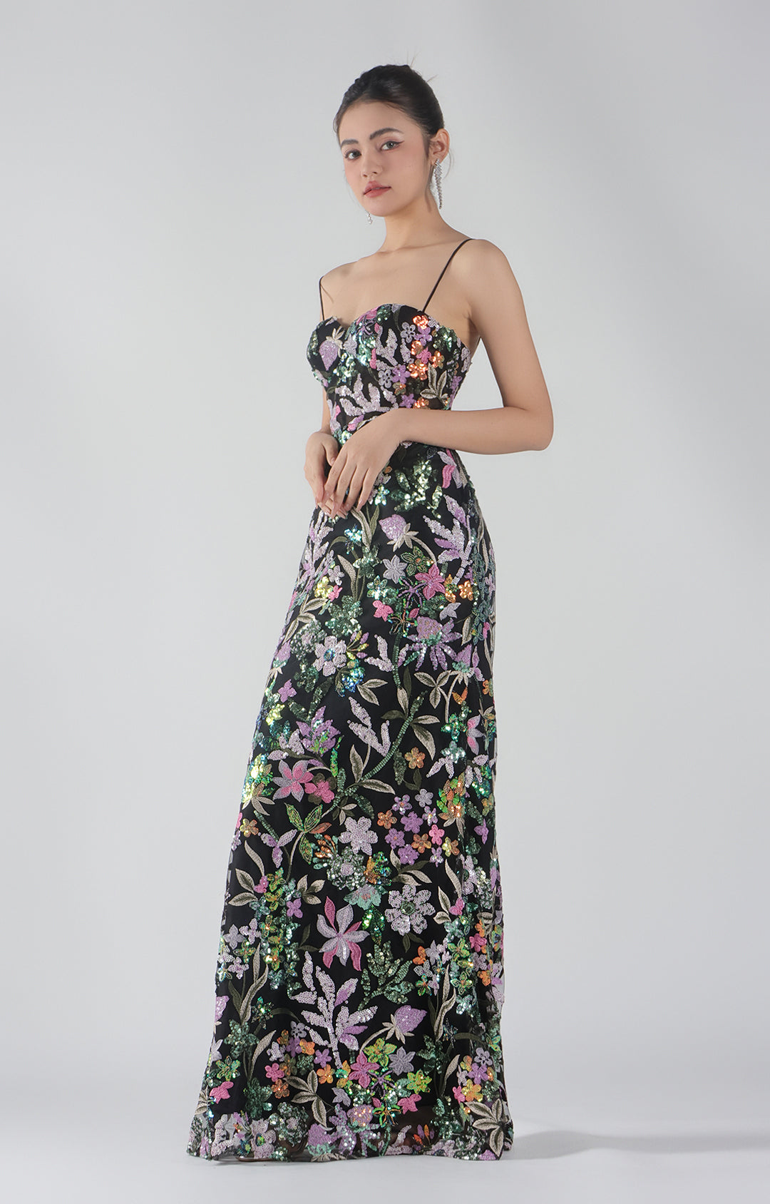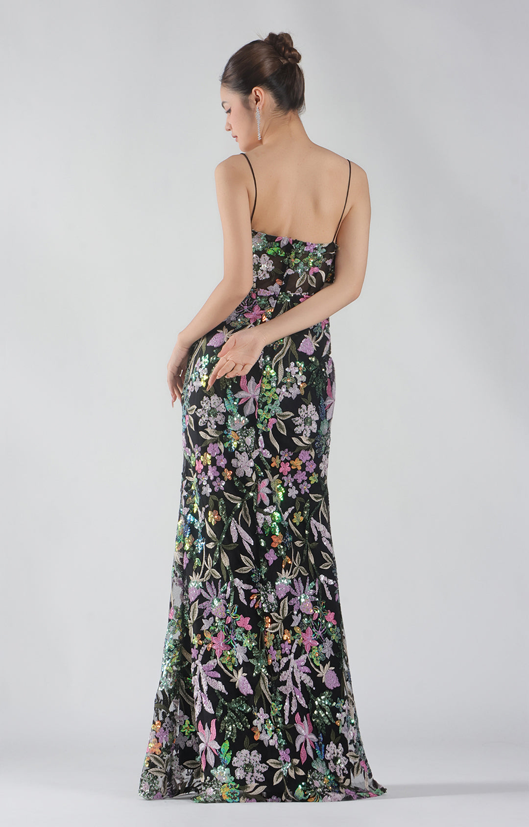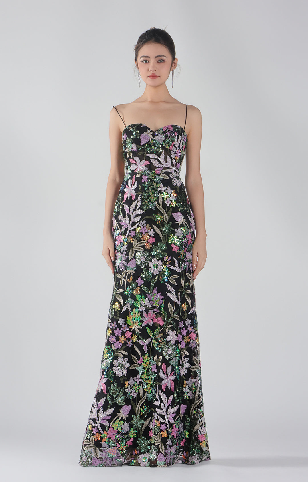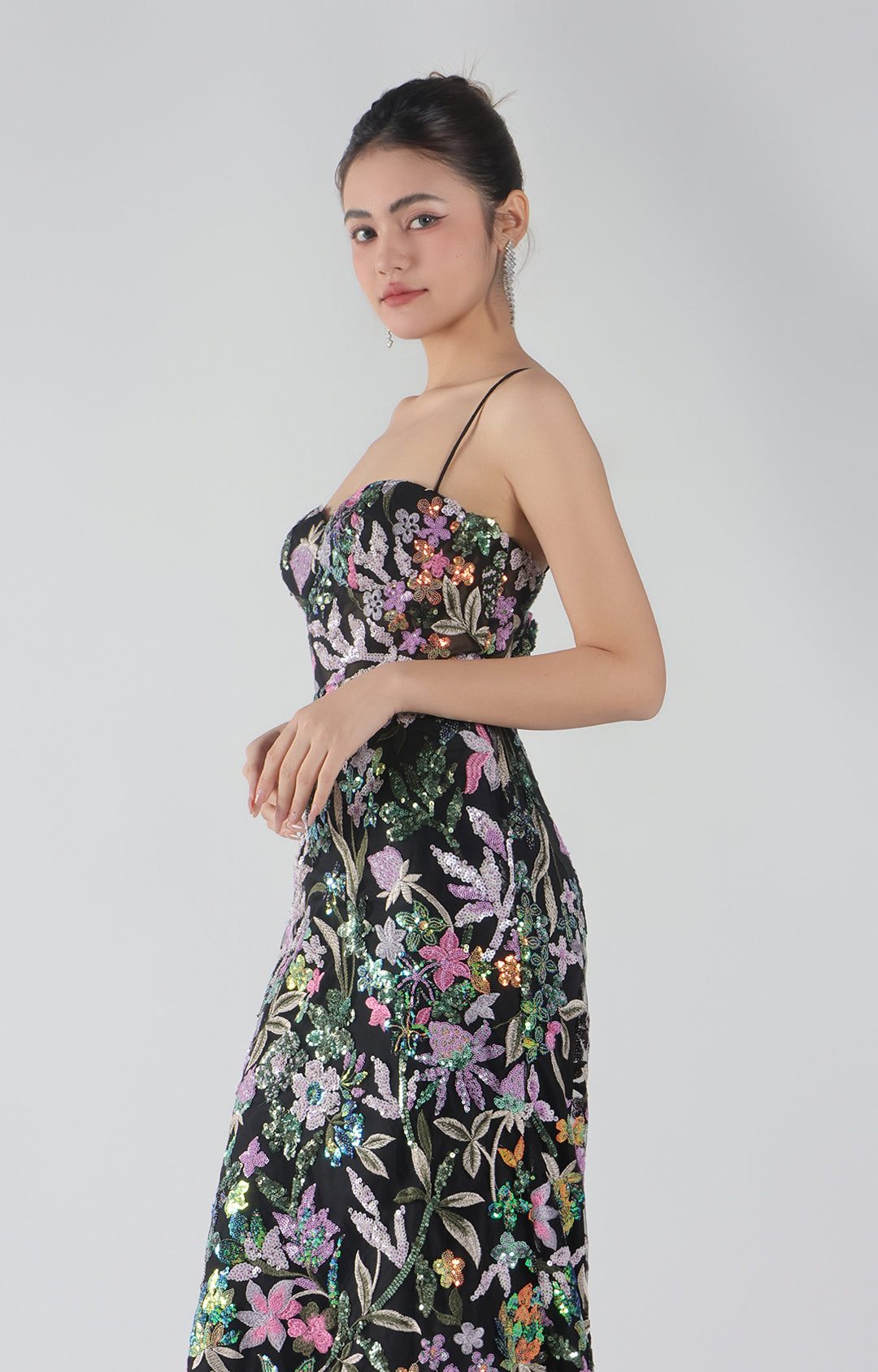 The dress features exquisite embroidery fabric, saprkling and charming.