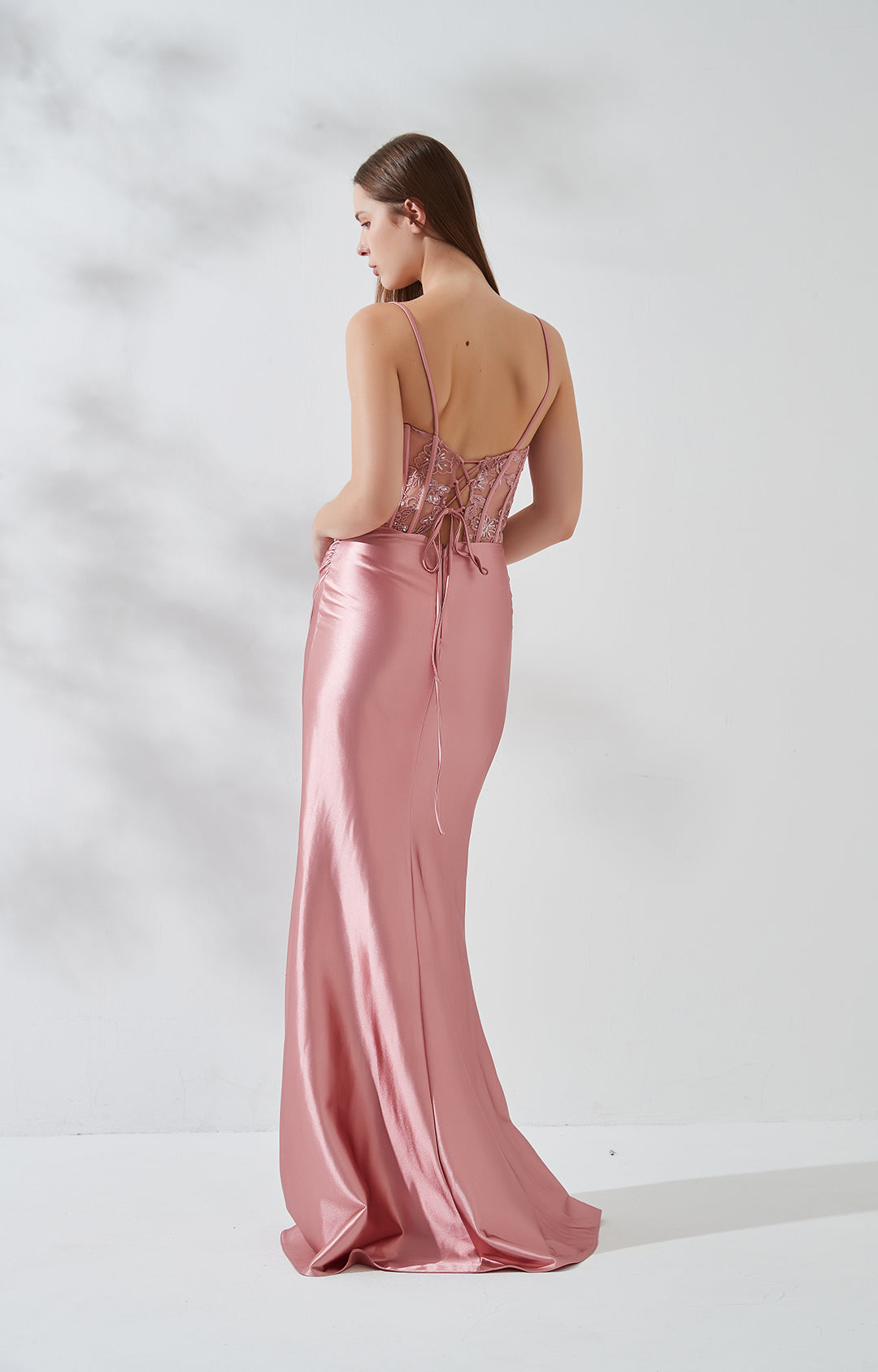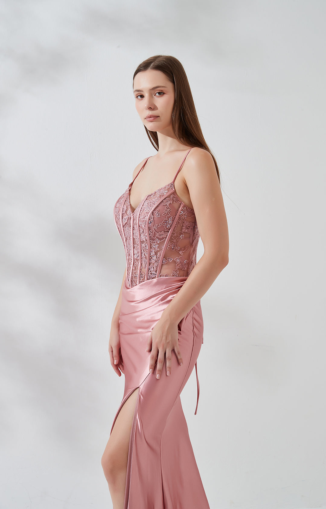 V-Neck Appliqued Split Fishbone Lace-up Back Evening Dress