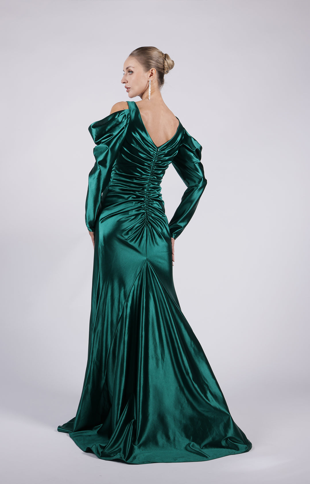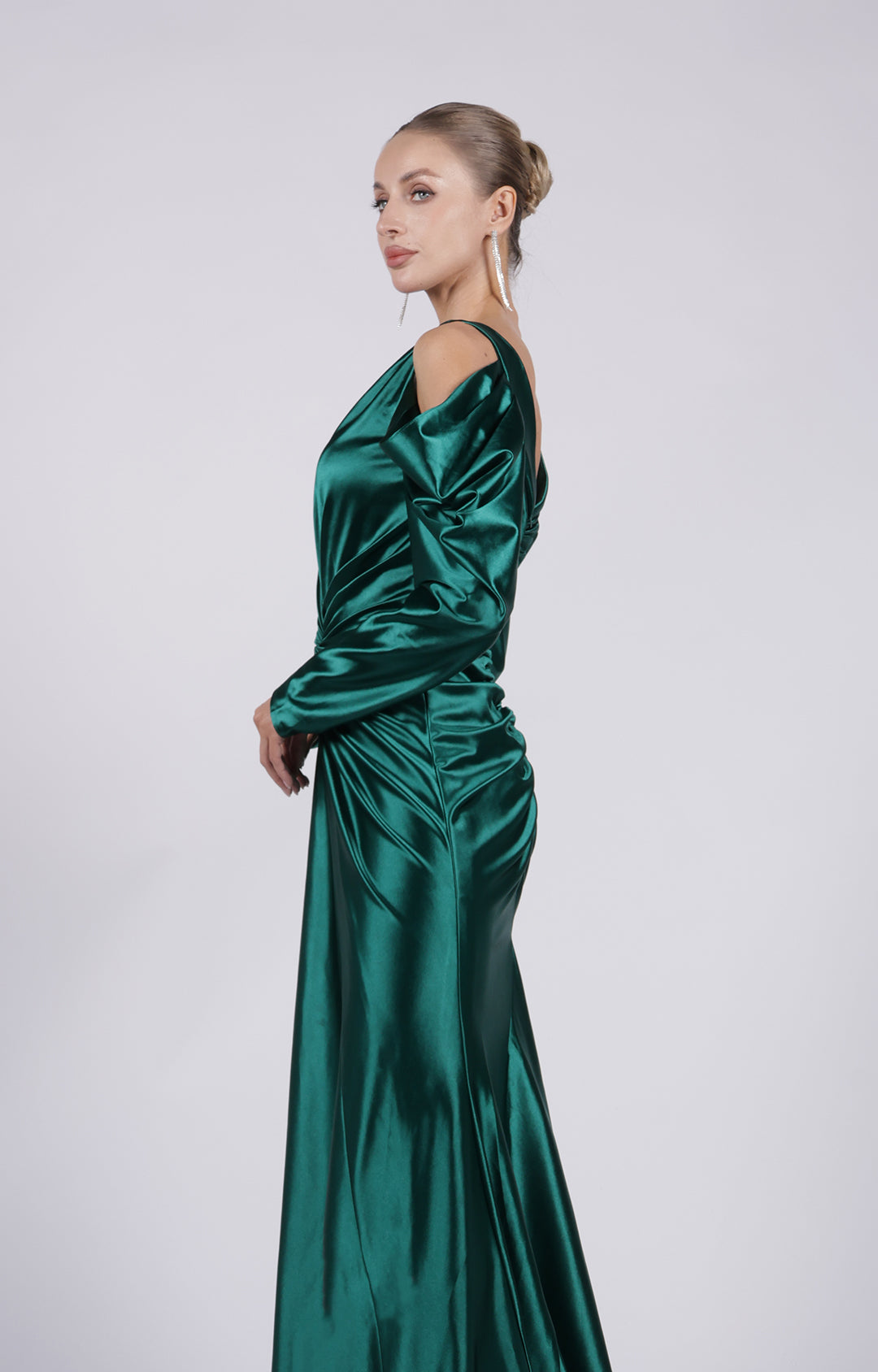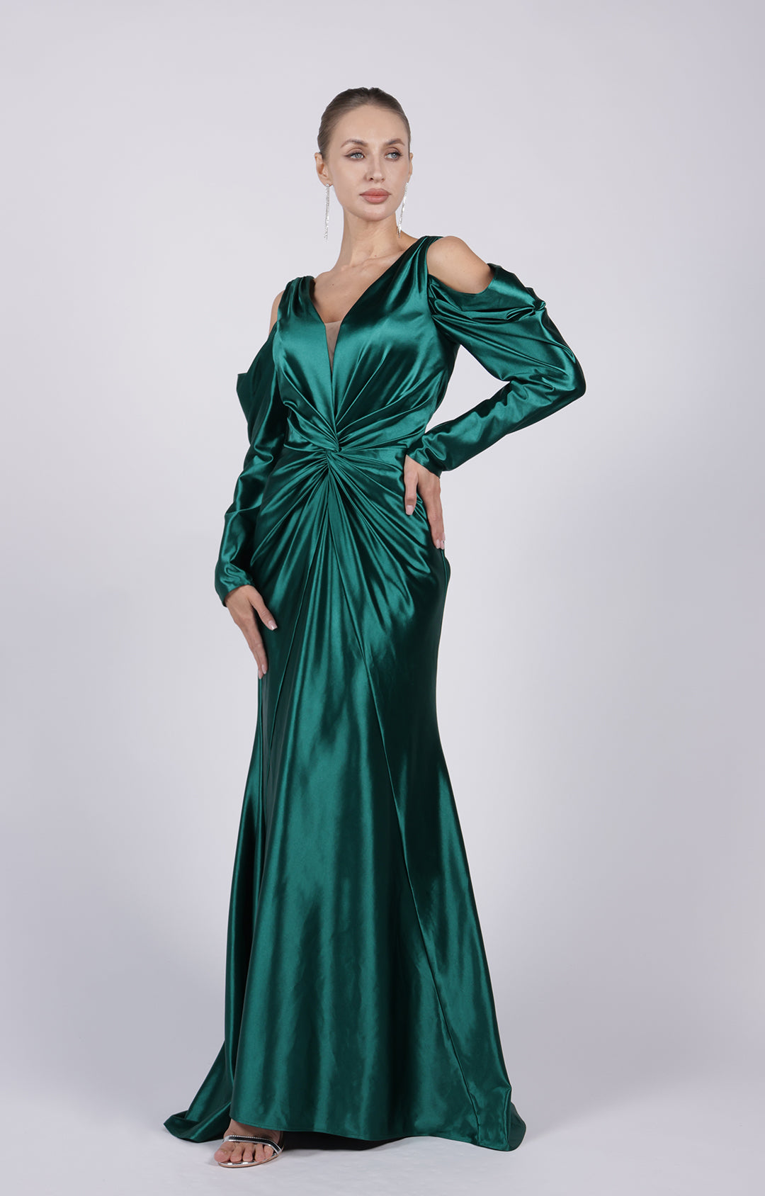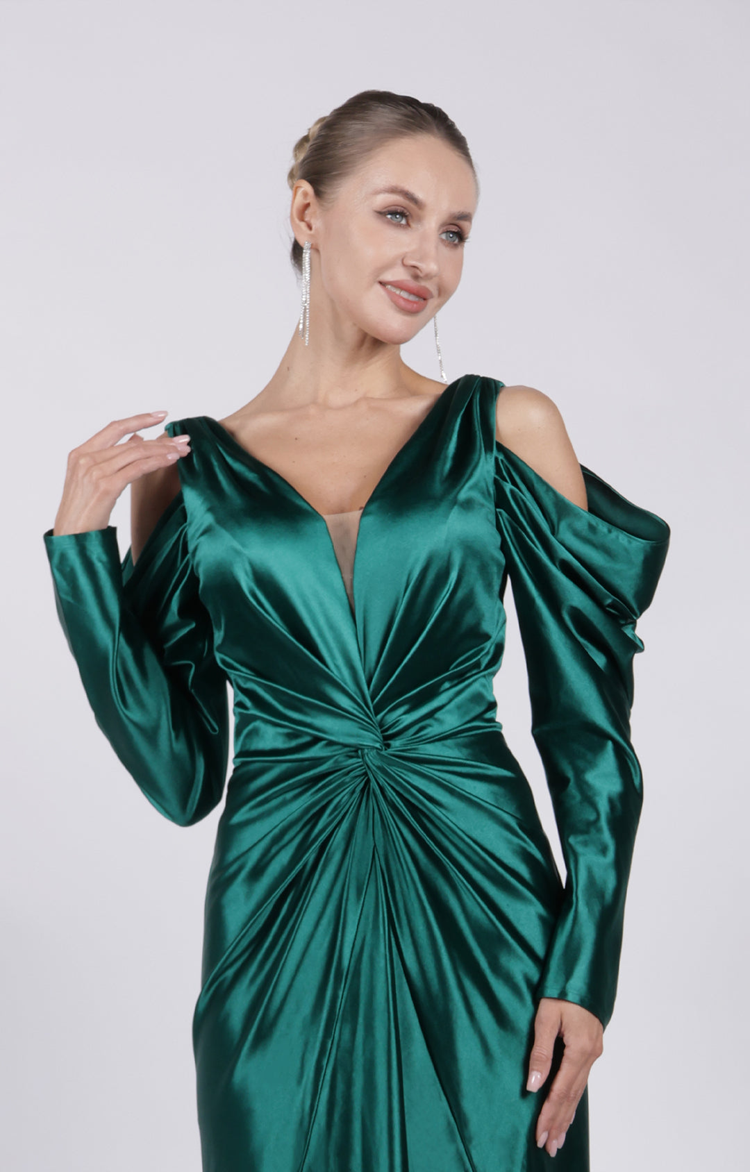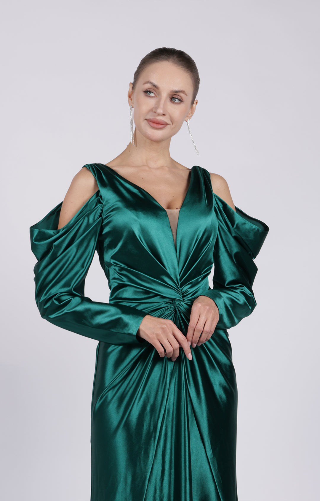 V-Neck Cut-Out Long Sleeves Wide Straps Pleated Satin Long Dress