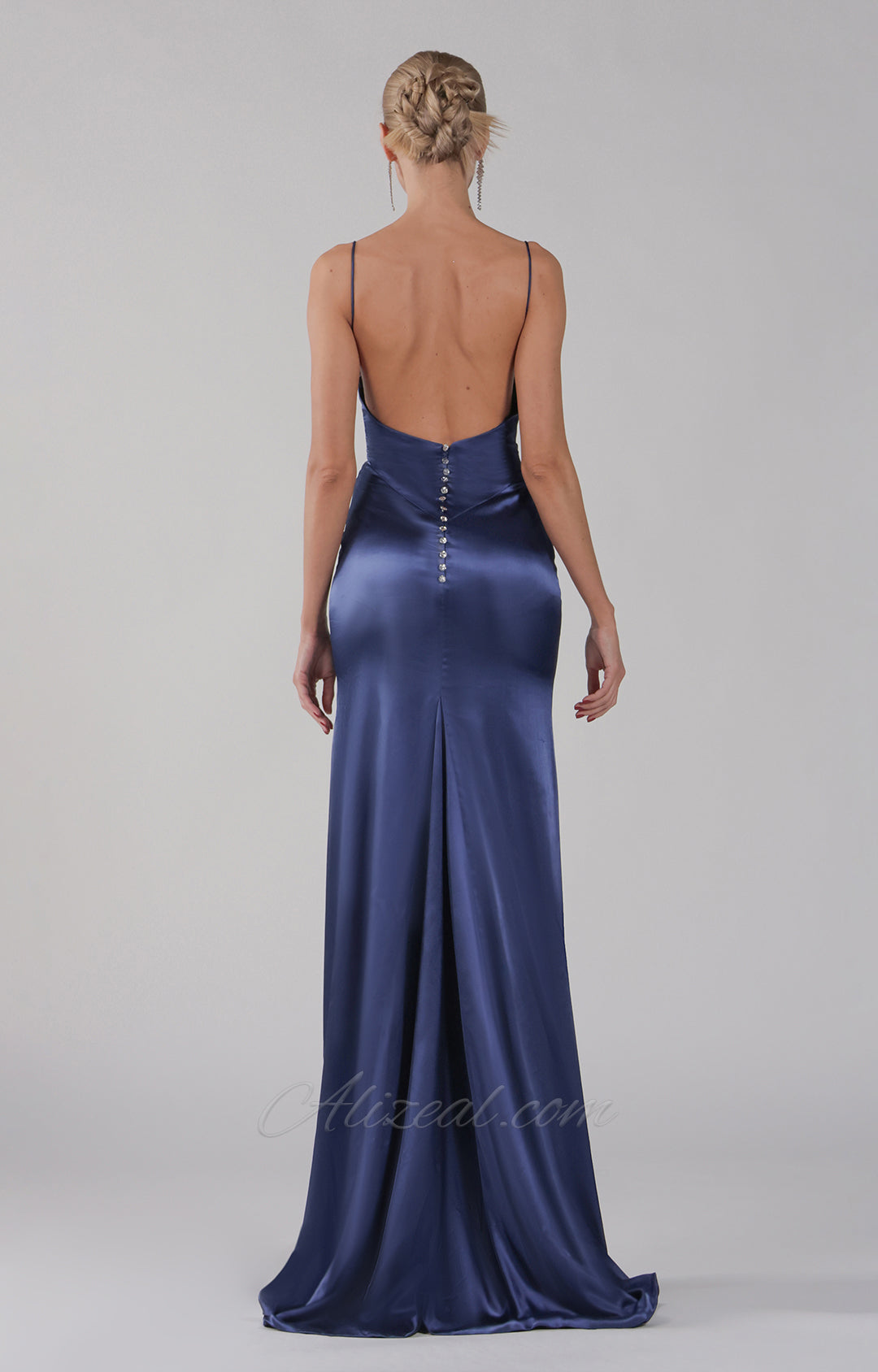 V-Neck Spaghetti Straps Backless Satin Sheath Maxi Dress