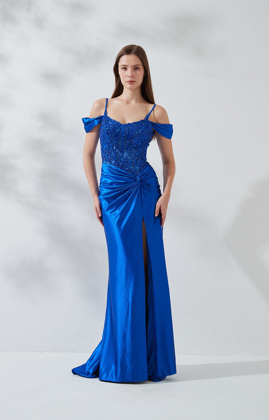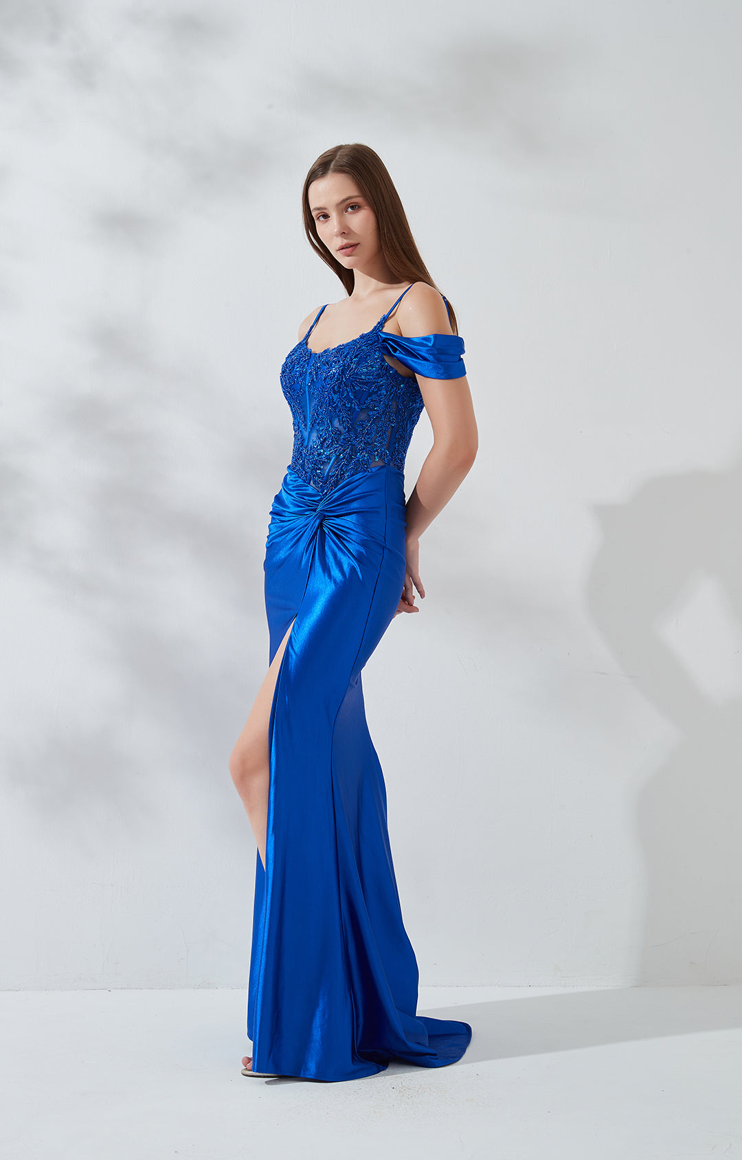 Drop-shoulder High Front Split Appliqued Zipper Prom Dress