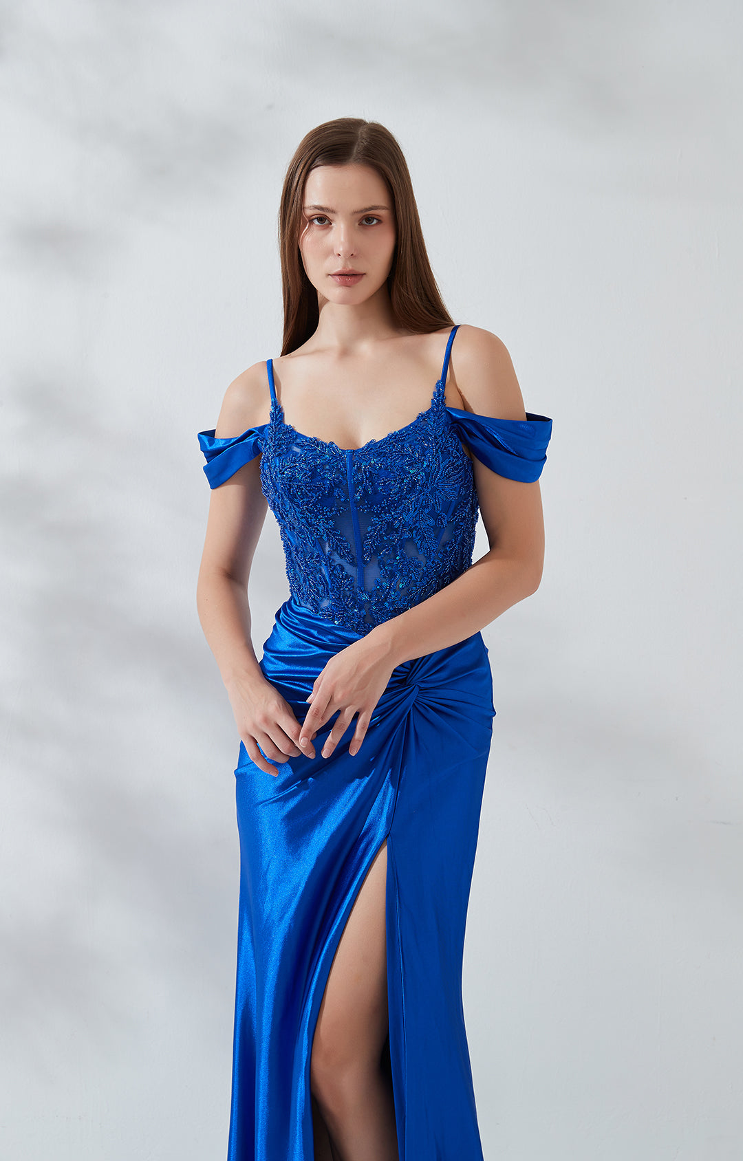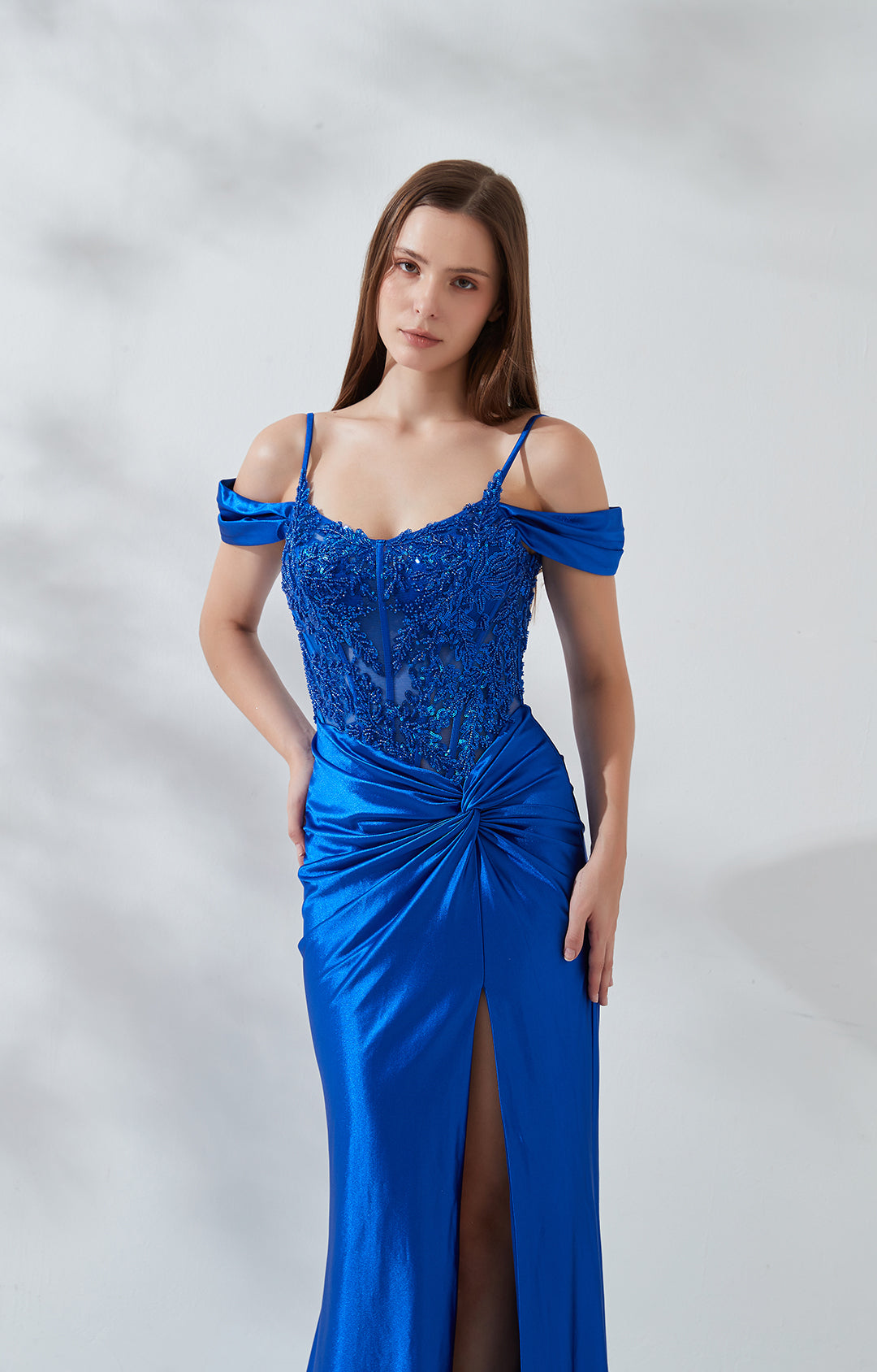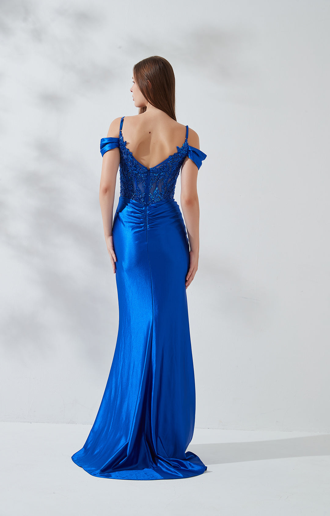 The fabric of the gown deviates by opting for a high-quality, elastic, and glossy polyester.